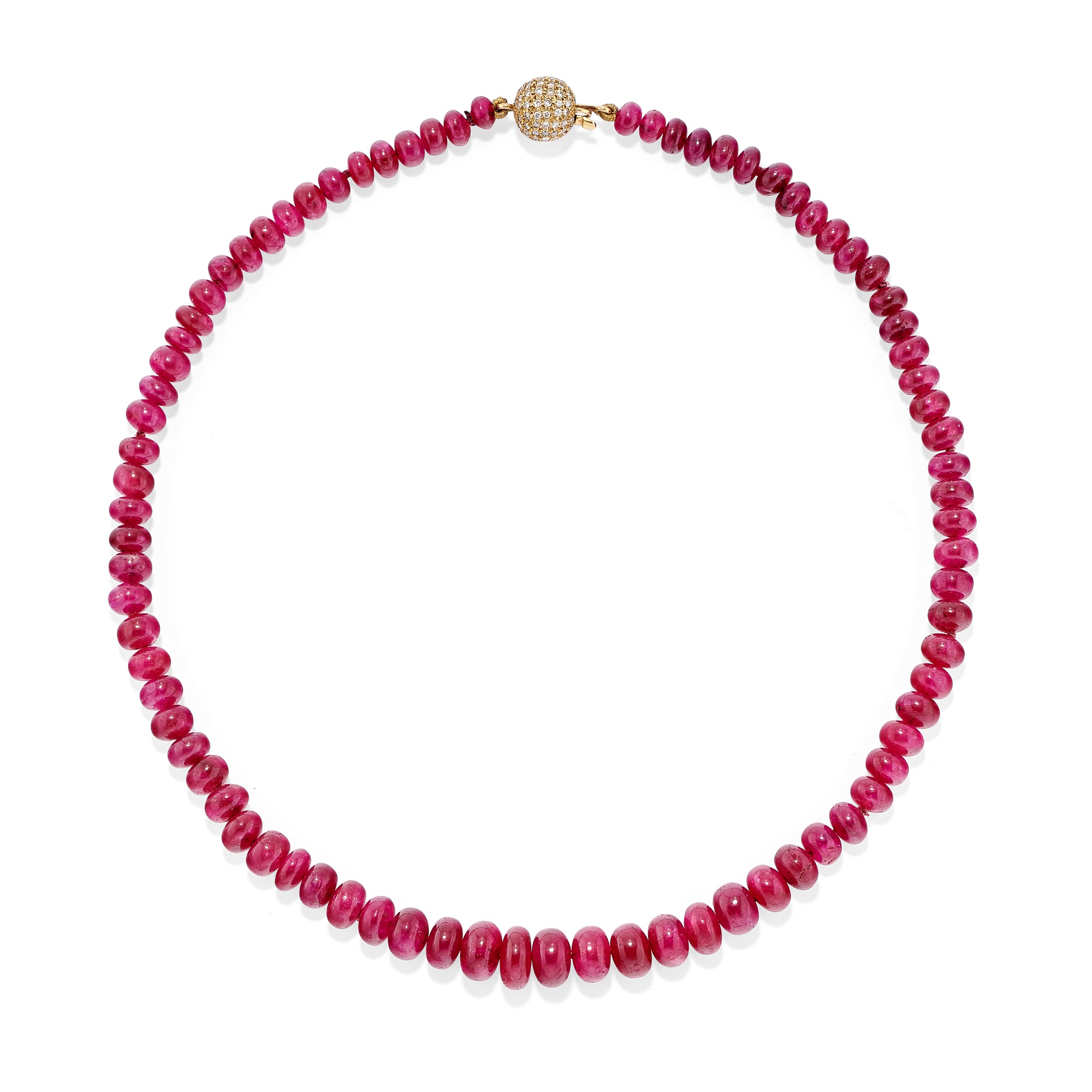ad un filo di rubini taglio disco disposti a degradè dal centro con chiusura a boule in diamanti taglio brillante per totale ct 1,40 circa.