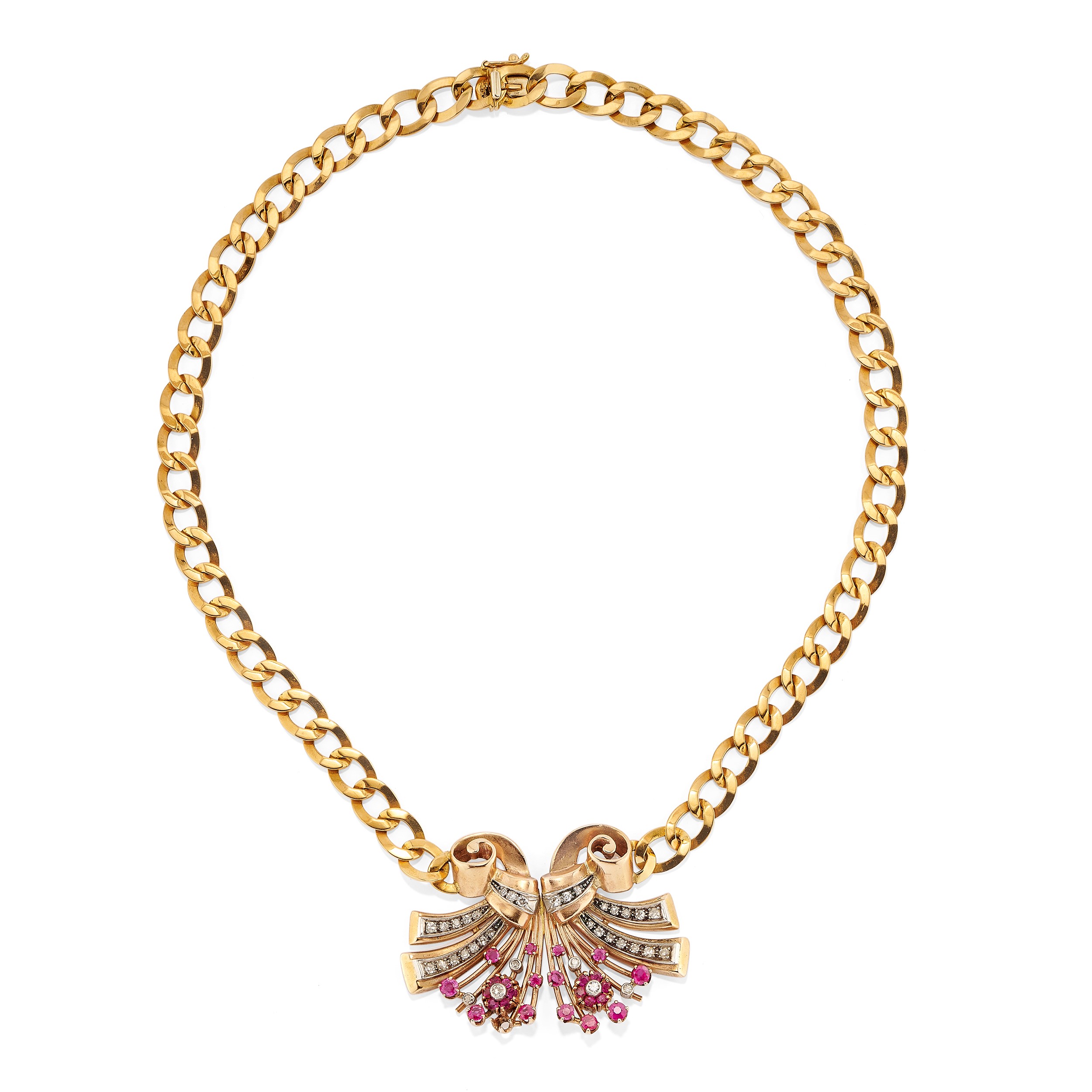 realizzata da catena a maglia groumette piatta (non coeva) che trattiene centrale con disegno floreale decorato da rubini taglio rotondo e diamanti taglio huit-huit, difetti (un rubino mancante)