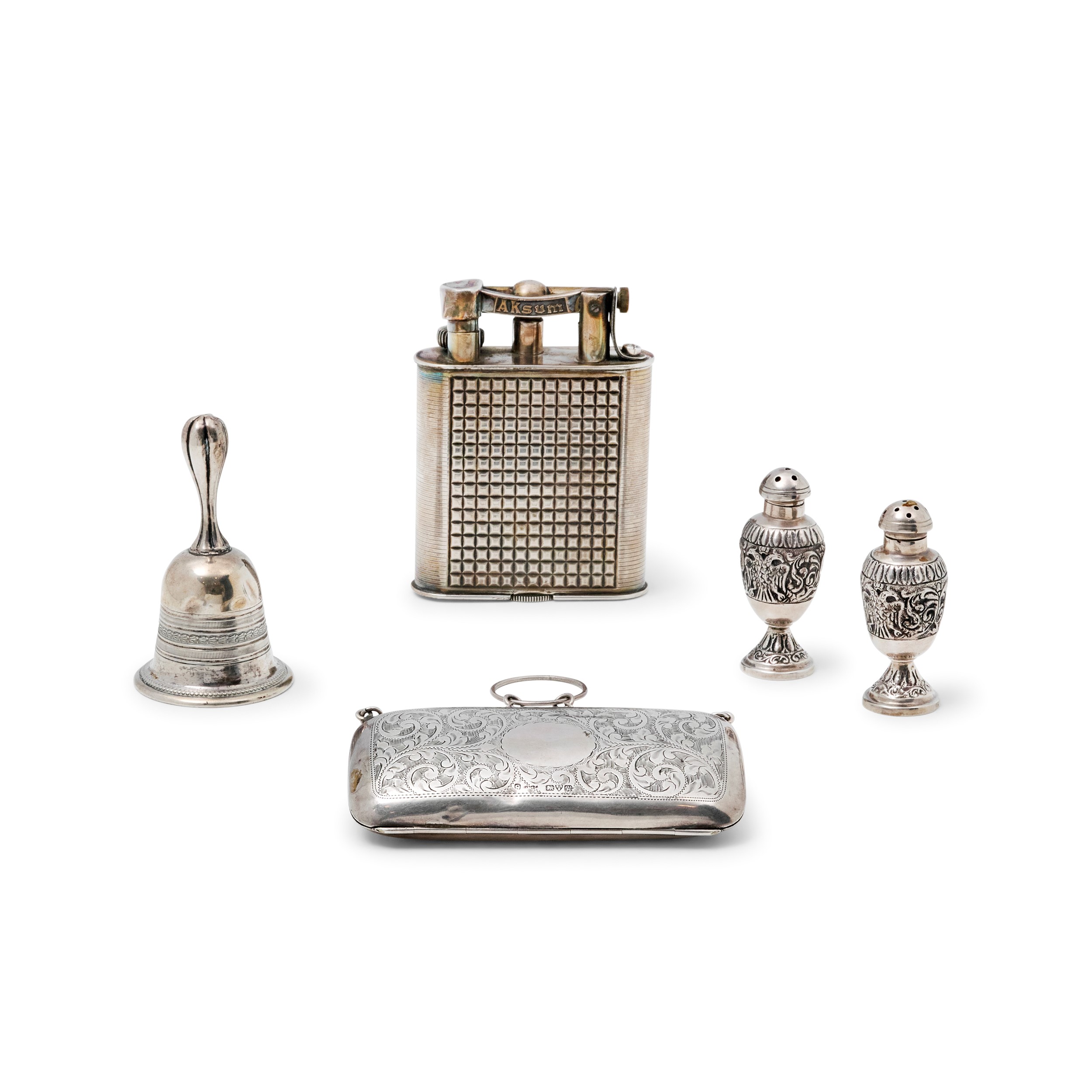 Due salierine, una campanella, una borsetta e un accendino da tavola in argento