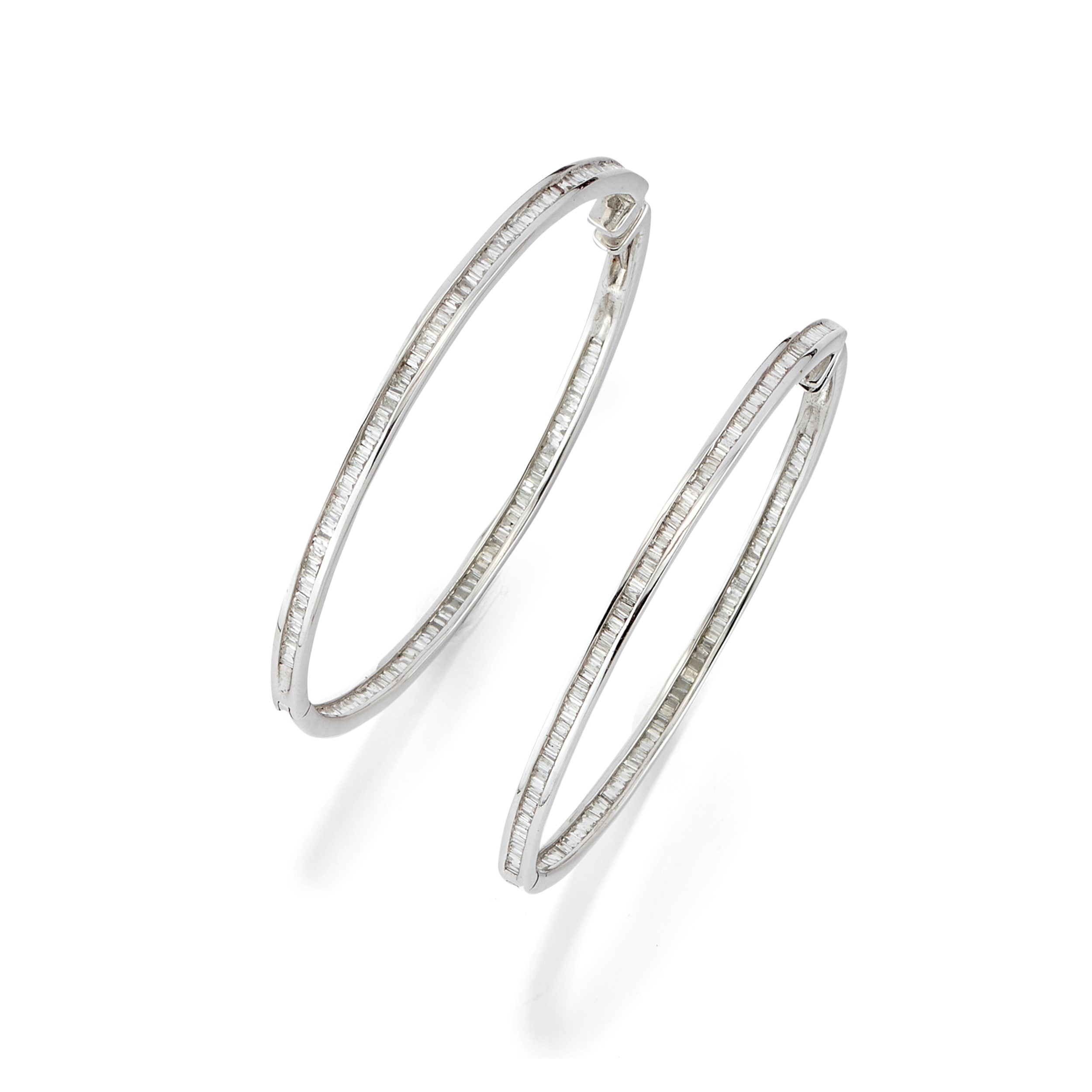 a cerchio, decorati internamente ed esternamente con diamanti taglio baguette, chiusura a perno.