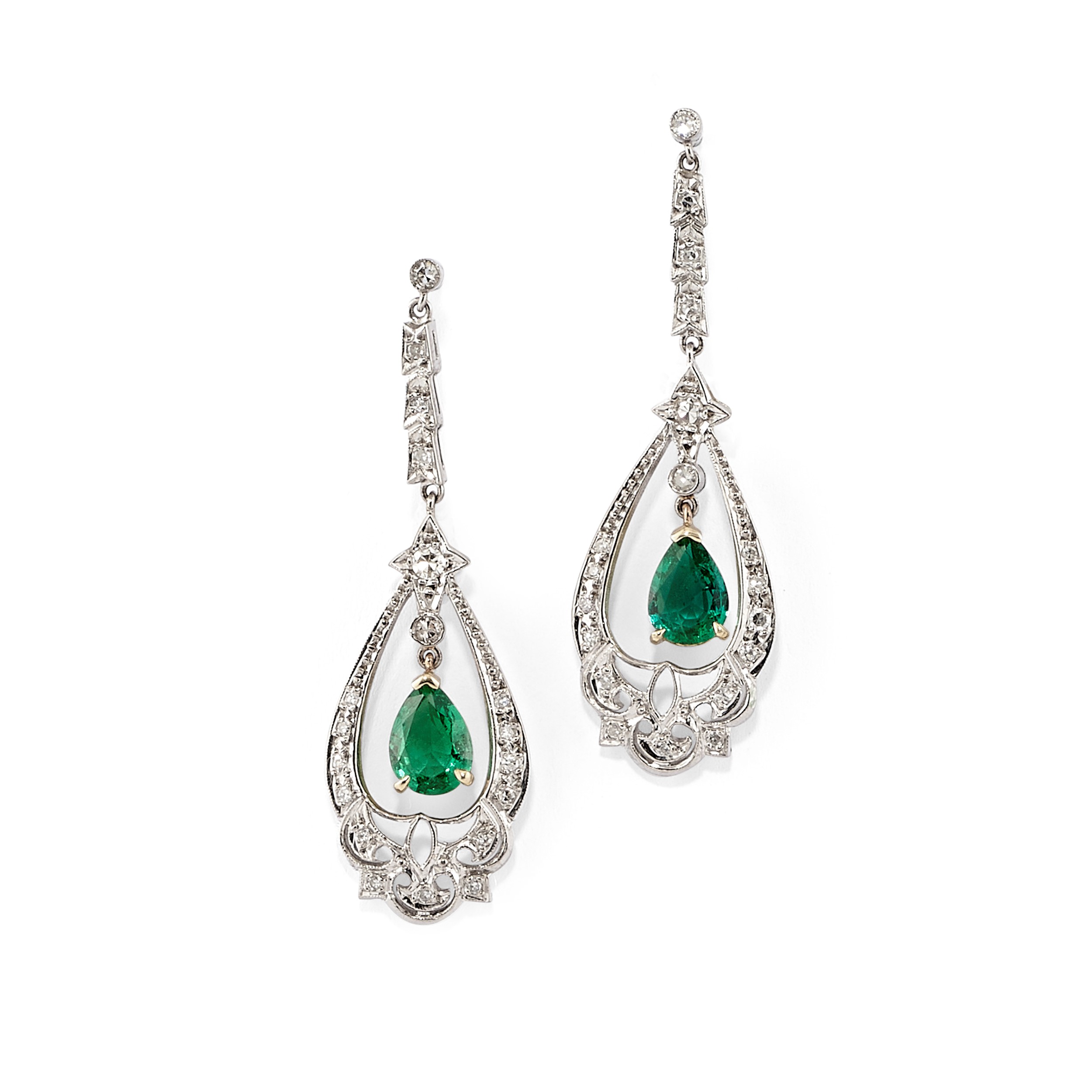 Orecchini in platino, oro 18k, diamanti e smeraldi, 1920 circa