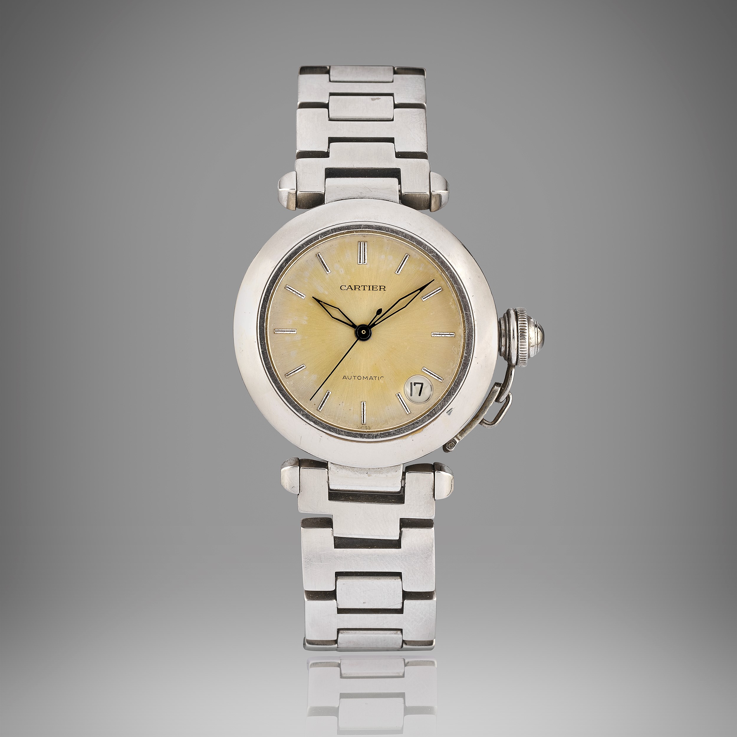 cassa rotonda in acciaio, quadrante argenté con indici applicati, movimento a carica automatica, bracciale in acciaio, con maglia aggiuntiva, scatola, libretti e garanzia, difetti (segni d'uso sul bracciale e patina sul quadrante).
