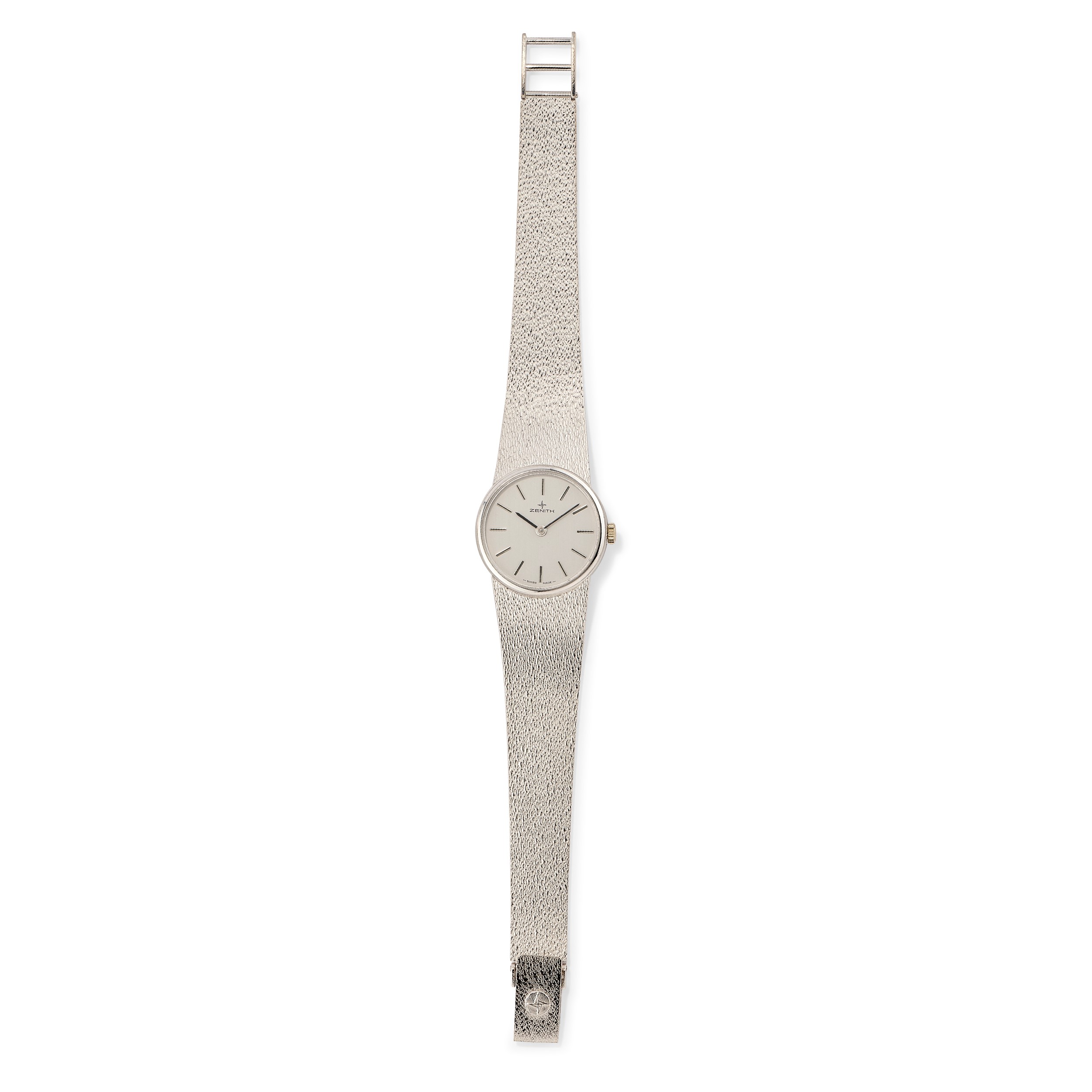 cassa rotonda, quadrante argenté, con indici applicati, movimento a carica manuale e bracciale integrato