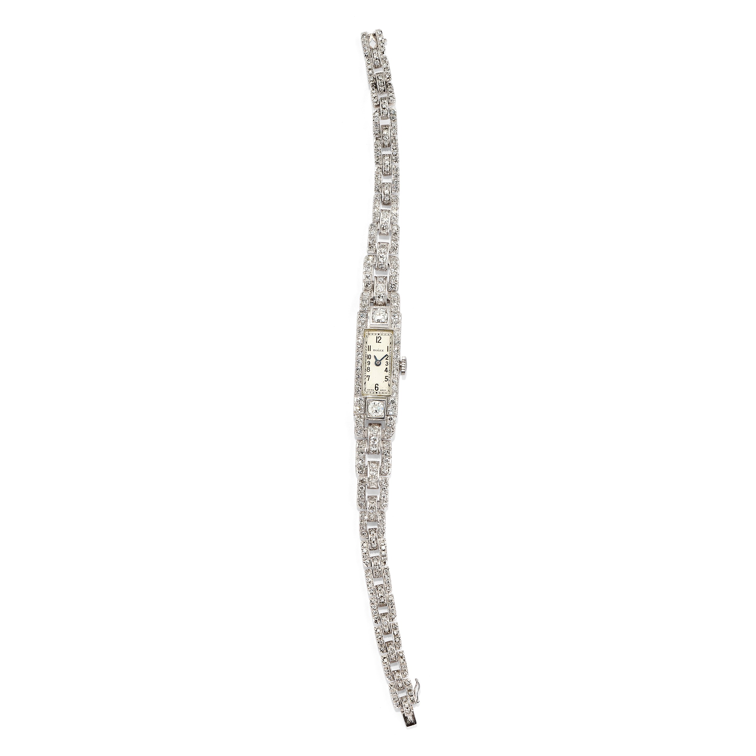 cassa rettangolare, quadrante chiaro firmato Rolex, numeri arabi in smalto nero, movimento a carica manuale, bracciale interamente decorato da diamante taglio huit-huit e brillante.