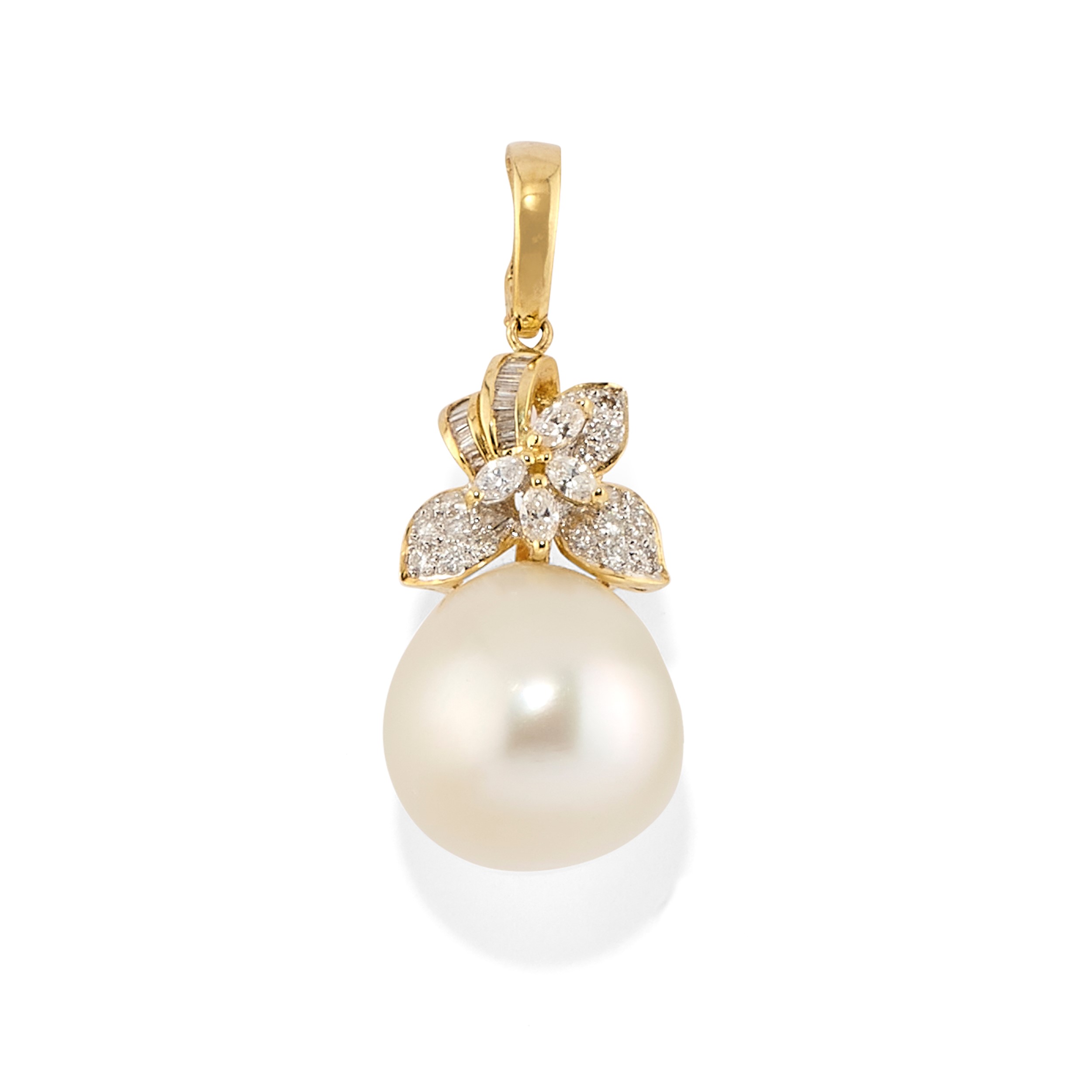 di gusto floreale con diamanti taglio brillante, navette e tapered baguette per totale ct 0,50 circa e perla coltivata di forma a pera di mm 16,00/16,50 circa, con gancio apribile.
