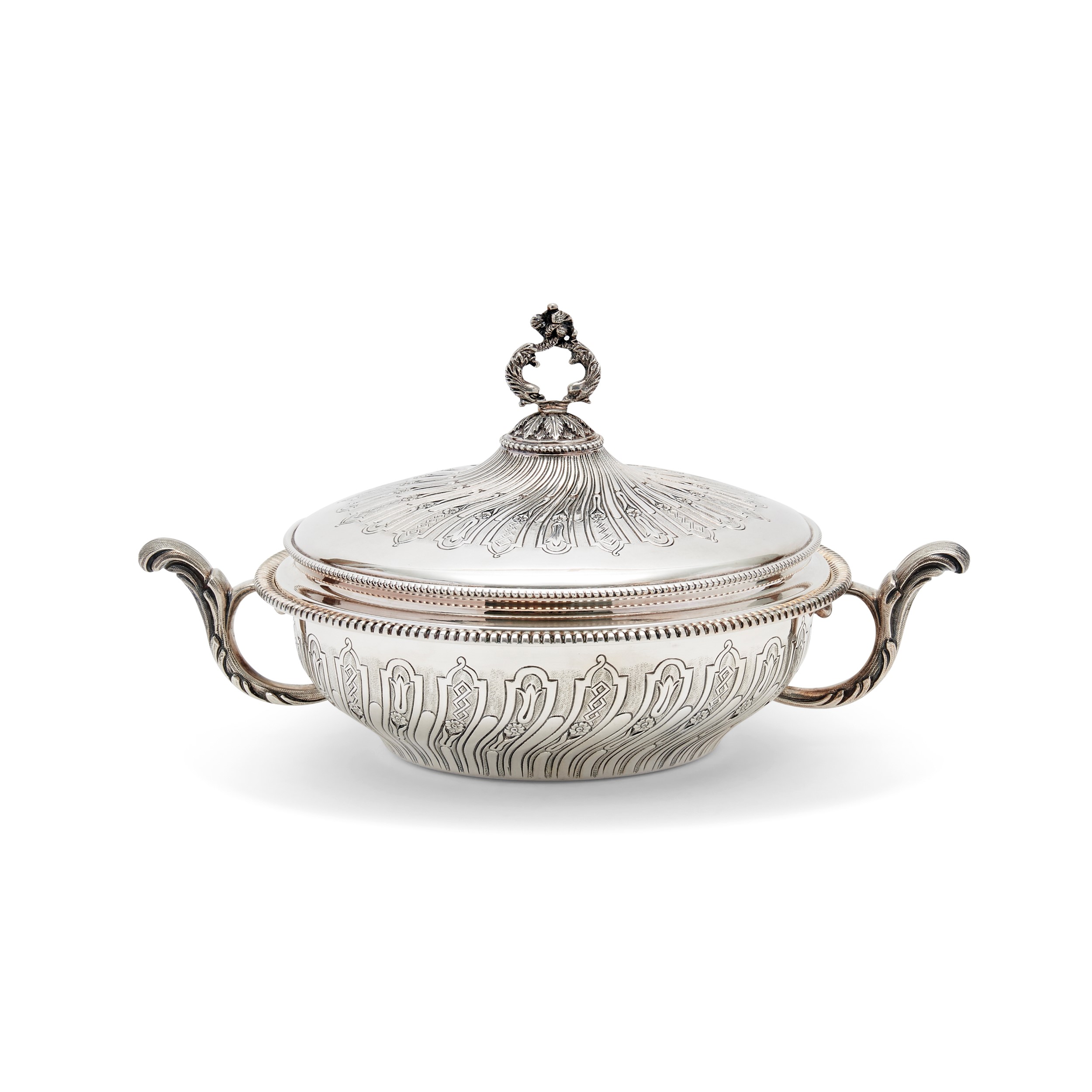 a due manici, interno in vermeil, coperchio con presa a due tritoni.
