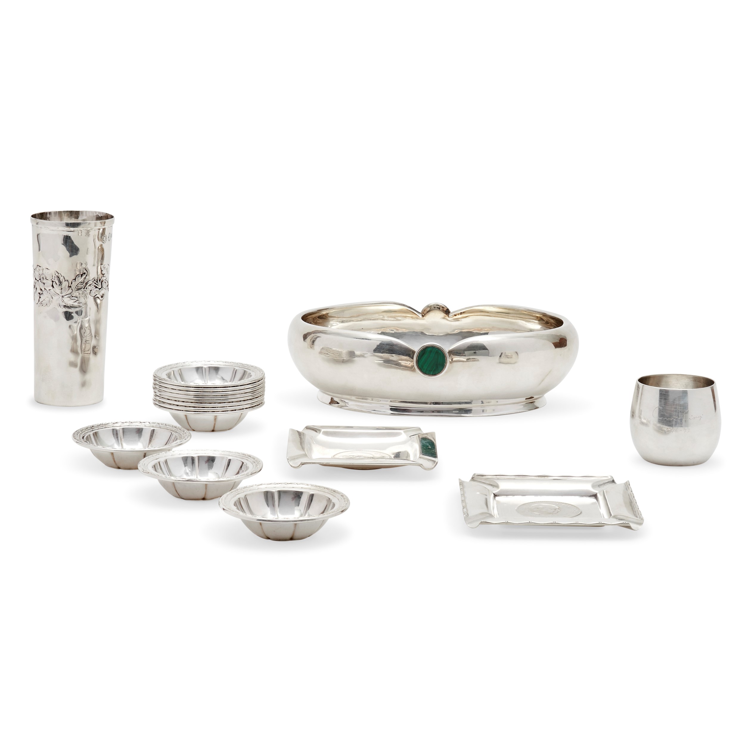 una ciotola porta dolci con pomelli in malachite, due posaceneri con medaglia Churchill, due bicchieri, undici ciotoline con iniziali JP.