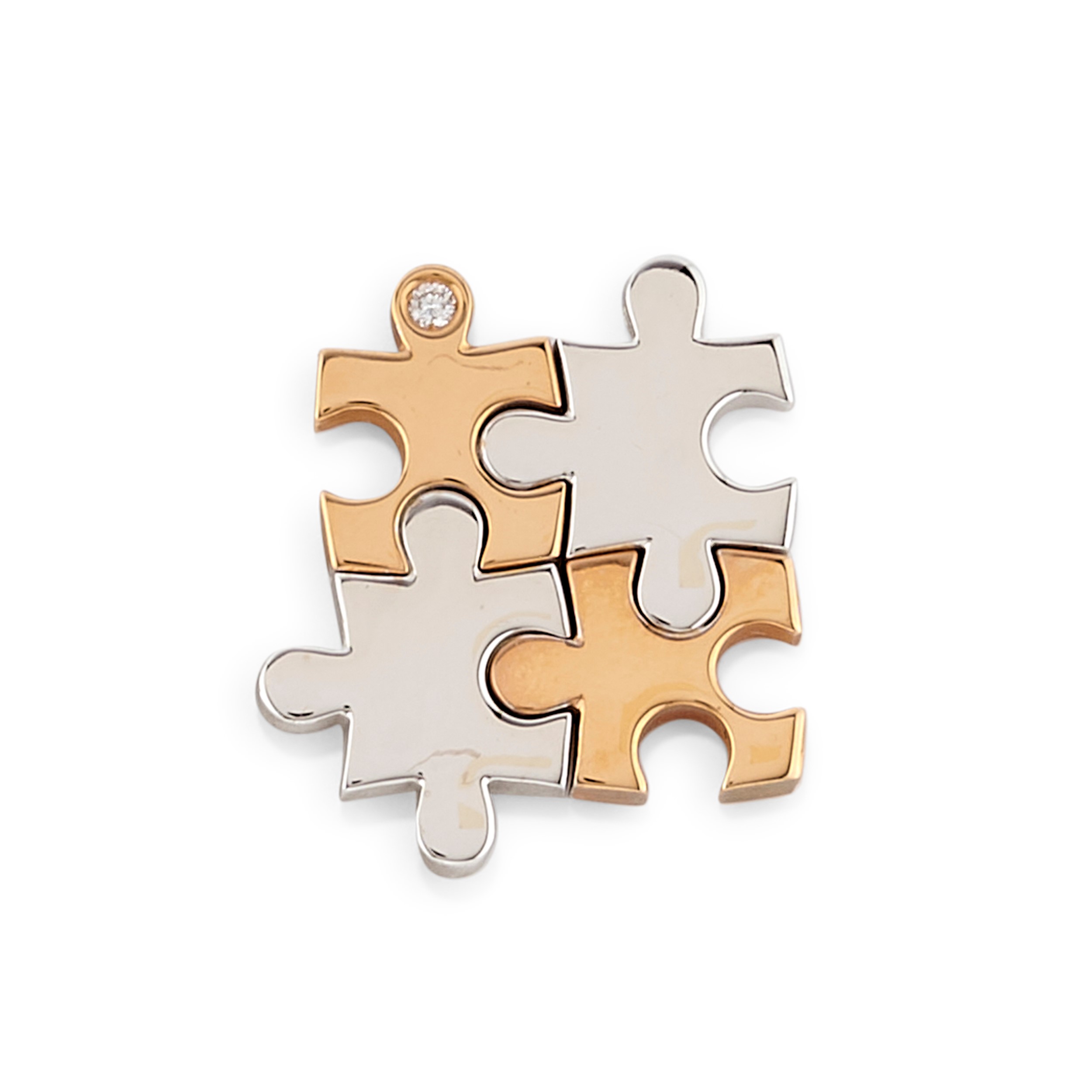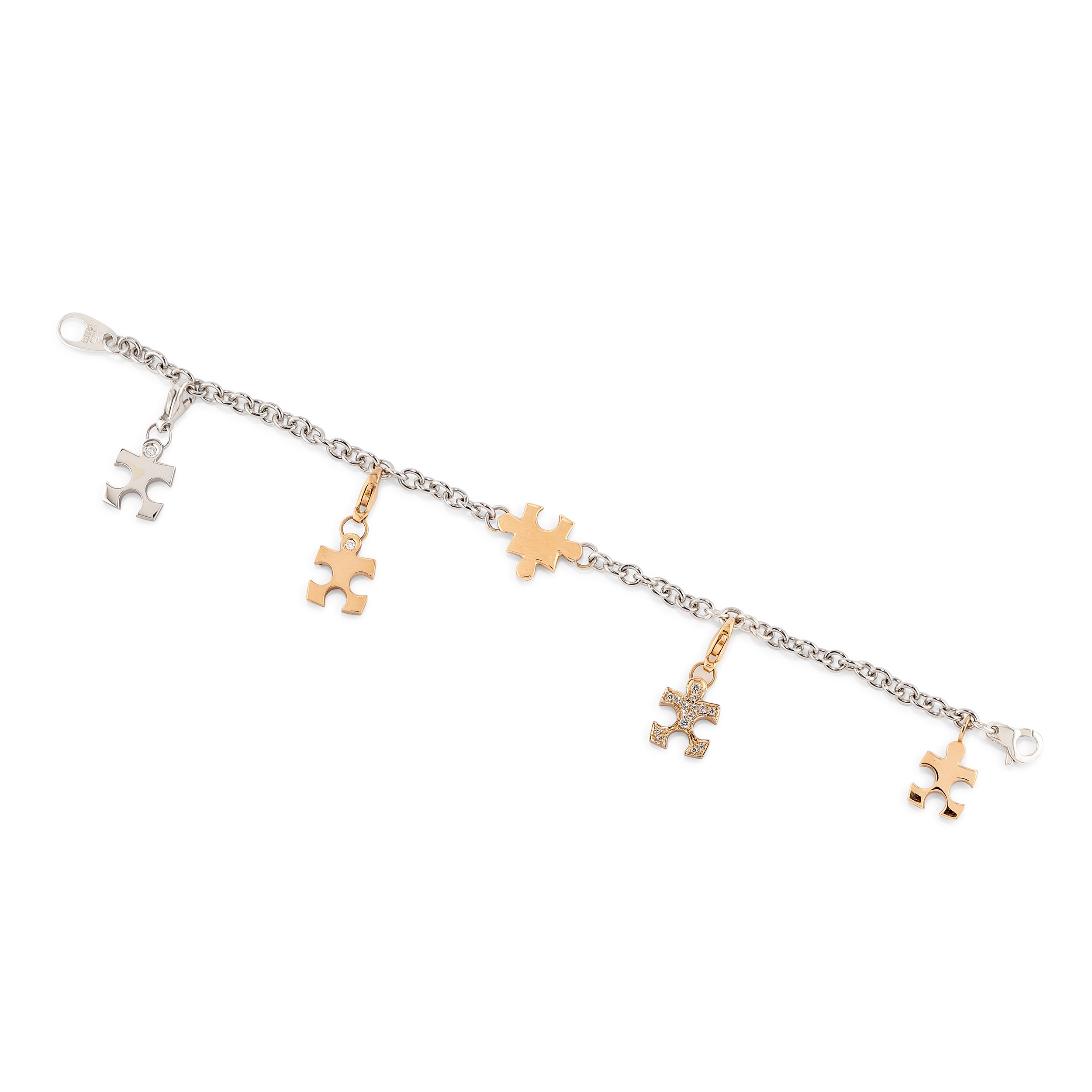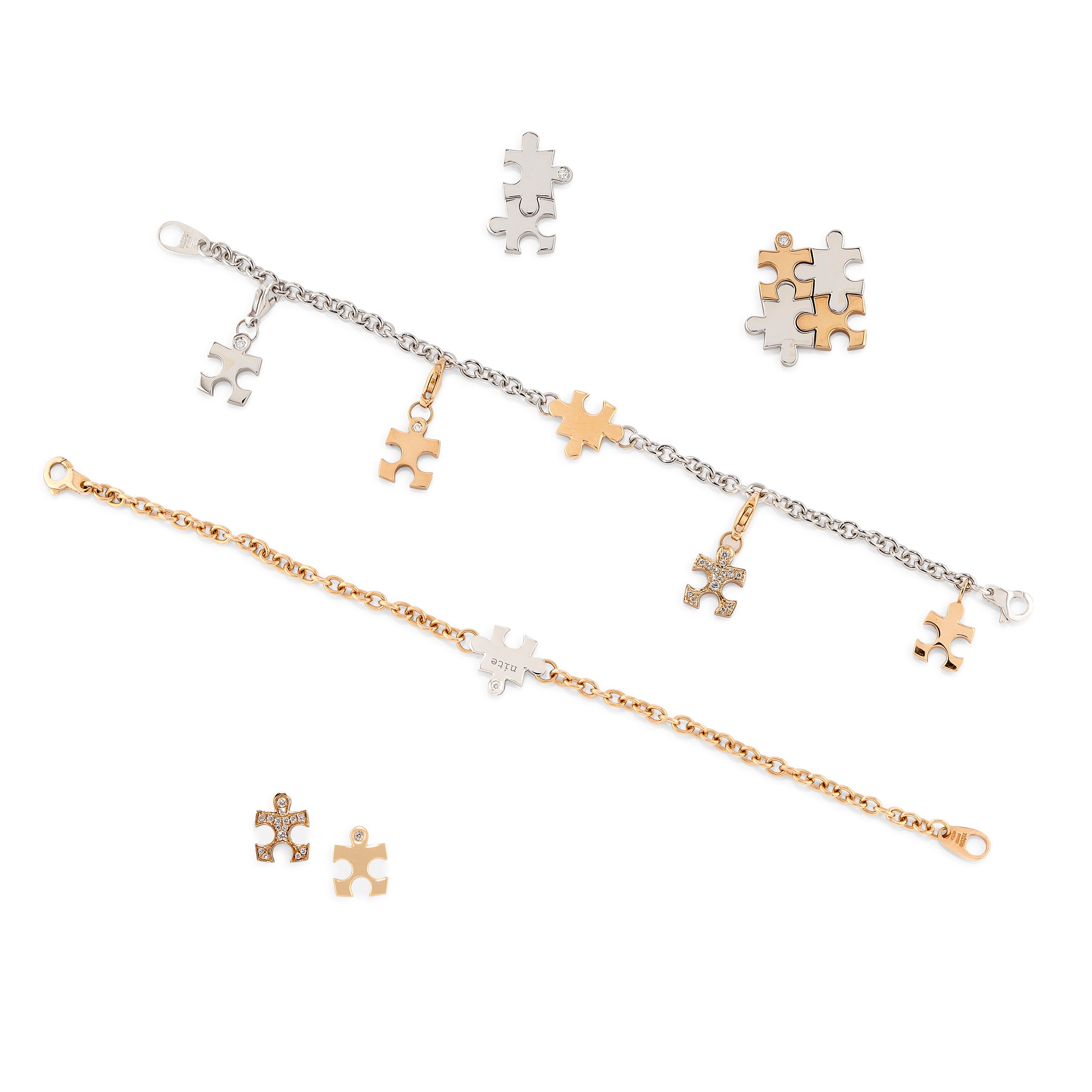 due bracciali, due pendenti e due orecchini singoli, con motivo a puzzle impreziosito da diamanti taglio brillante.