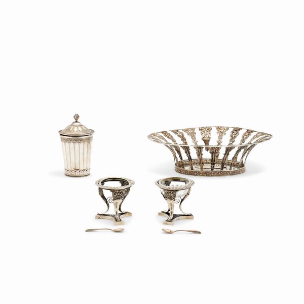 composto da: un cestino, due salierine con vetro e due cucchiaini, un bicchiere porta spezie con vetro interno, difetti (rotture e mancanze, un vetro della salierina mancante). Peso netto g 825,00 cesto cm 29,00x22,00x8,50