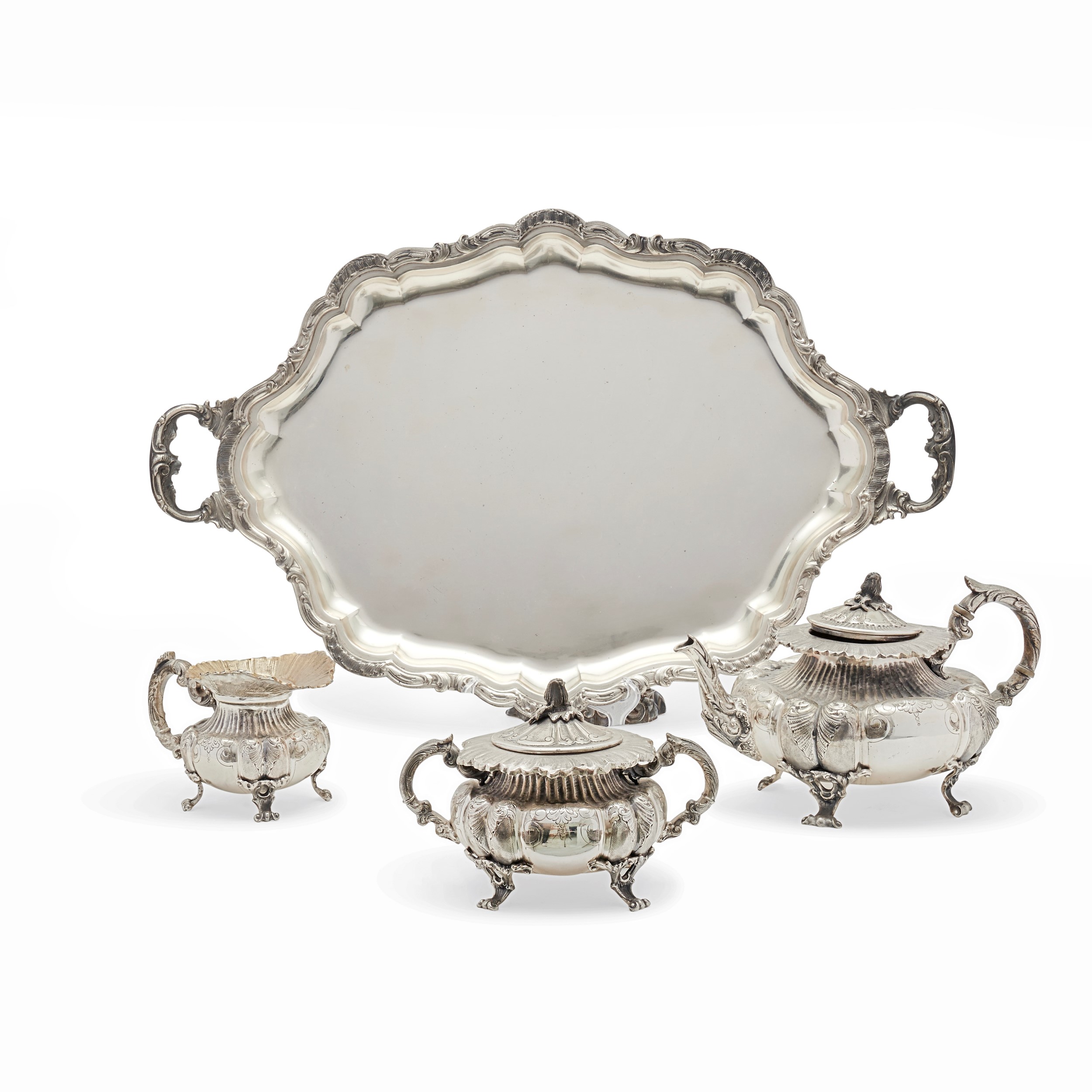 composto da teiera, zuccheriera, lattiera con interno in vermeil e vassoio a due manici a profilo mistilineo con decoro floreale e incisioni.