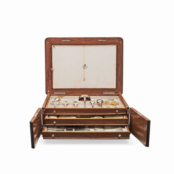 composto da 160 pezzi: 12 cucchiai grandi, 24 forchette grandi, 12 coltelli grandi, 12 forchette da pesce, 12 coltelli da pesce, 12 forchette da frutta, 12 coltelli da frutta, 12 forchette da dolce, 12 cucchiai da gelato, 12 cucchiai da dolce, 12 cucchiai da caffè e 16 serviti, punzoni del Fascio, con scatola in legno.