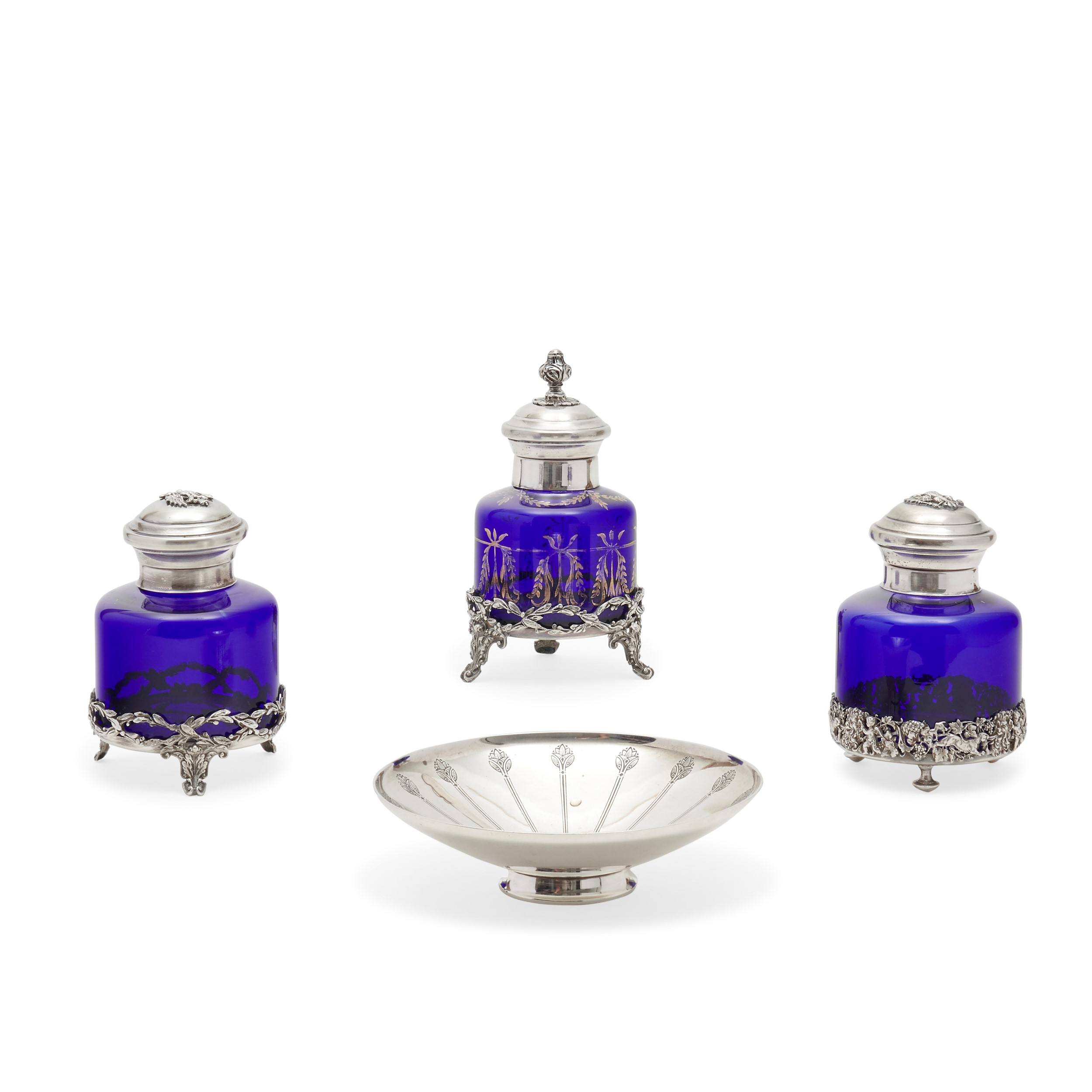 composto da tre vasi in argento e vetro dipinto e una ciotola.
