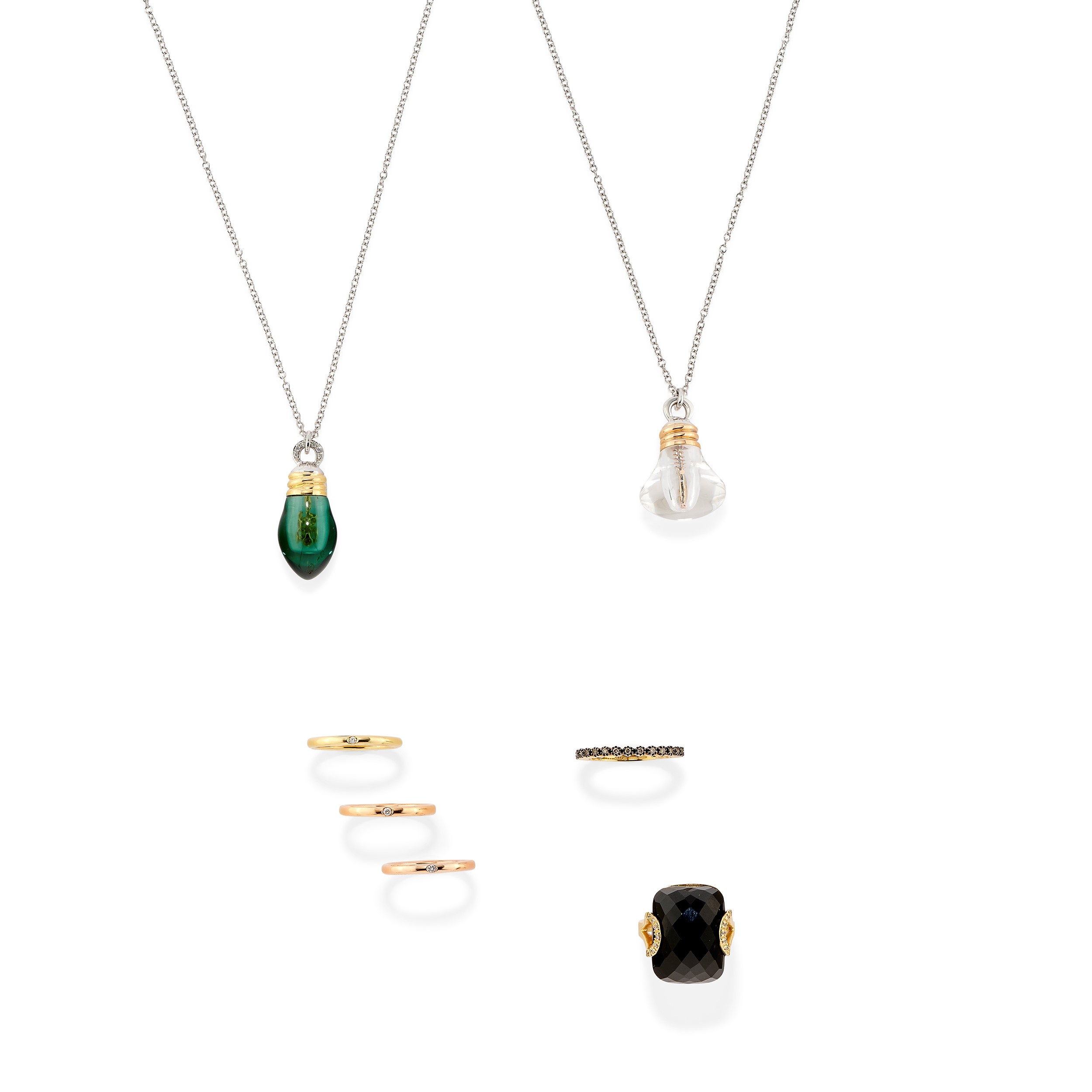 Sette gioielli nei tre ori 18k, diamanti, onice e cristallo di rocca