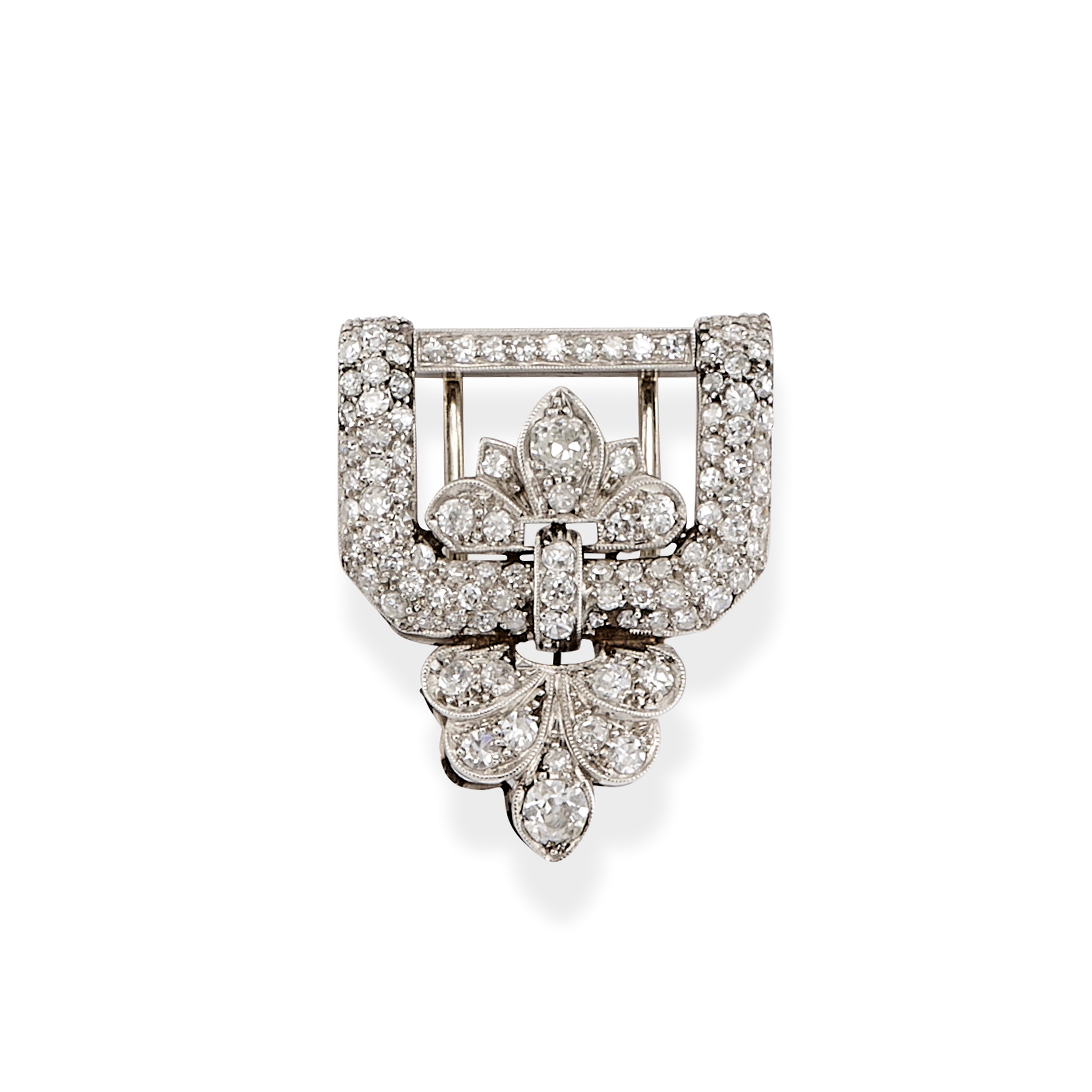 a clip, di forma geometrica con decoro fogliaceo, interamente decorata da diamanti taglio vecchio, lavorazione a milligrano.