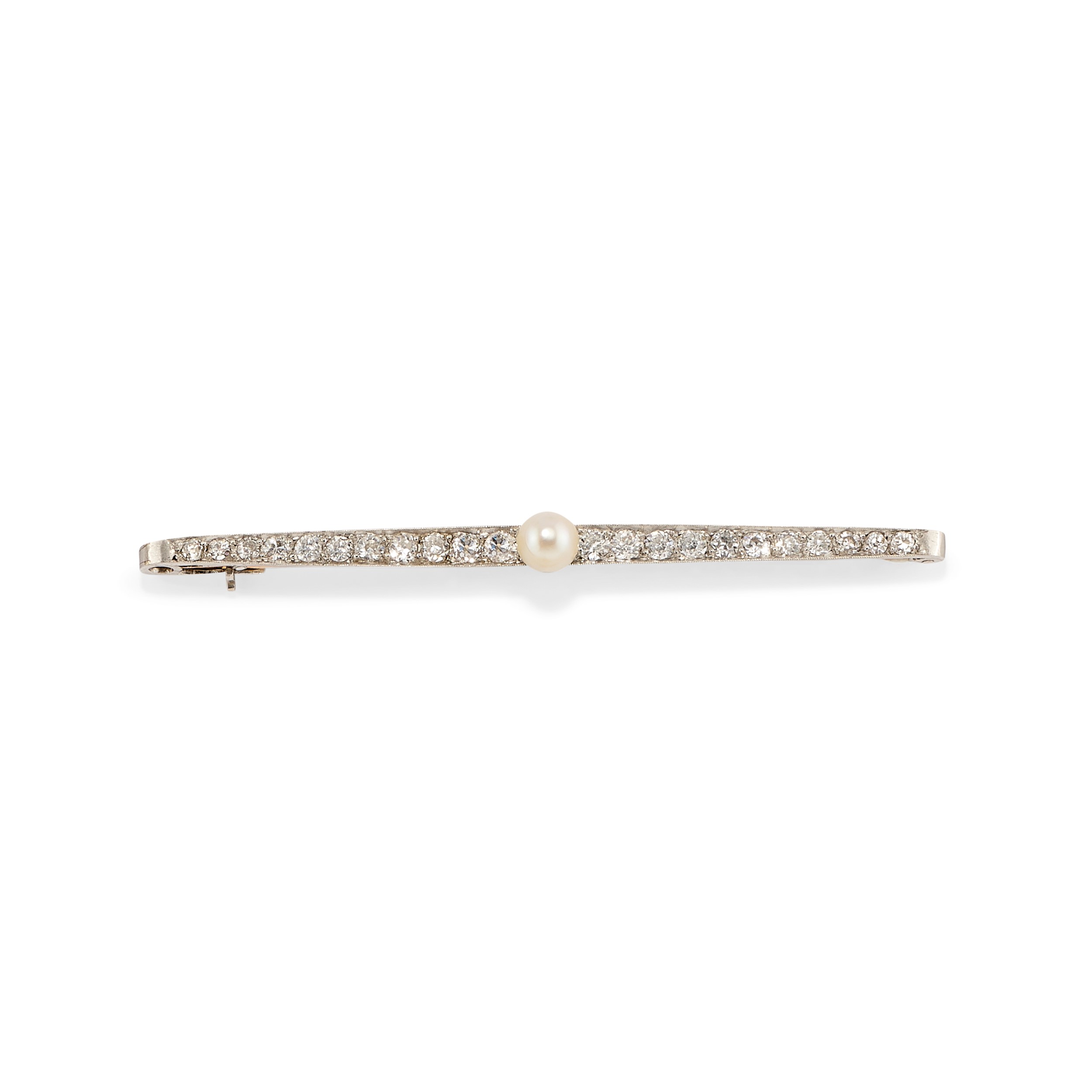 a barretta con diamanti taglio vecchio per totale ct 1,50 circa e perla, punzoni francesi, gioiello numerato.