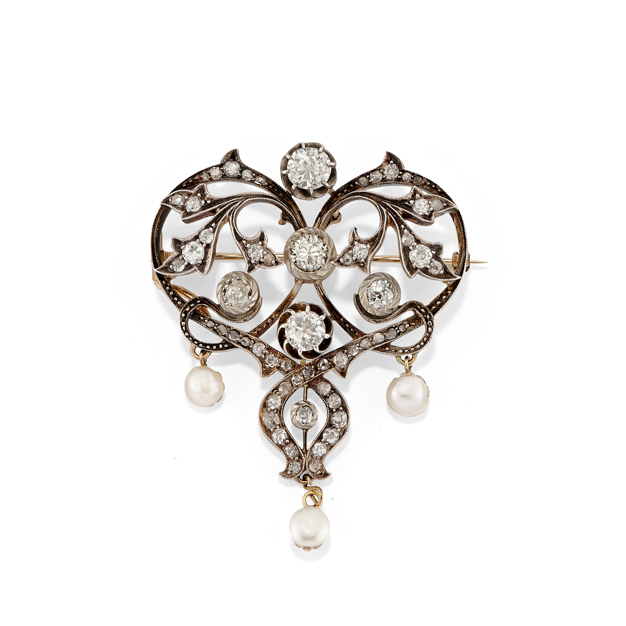 realizzata a volute e decorata da diamanti taglio vecchio per totale ct 4,50 circa e tre perle pendenti (prob. naturali d'acqua dolce), con astuccio d'epoca.