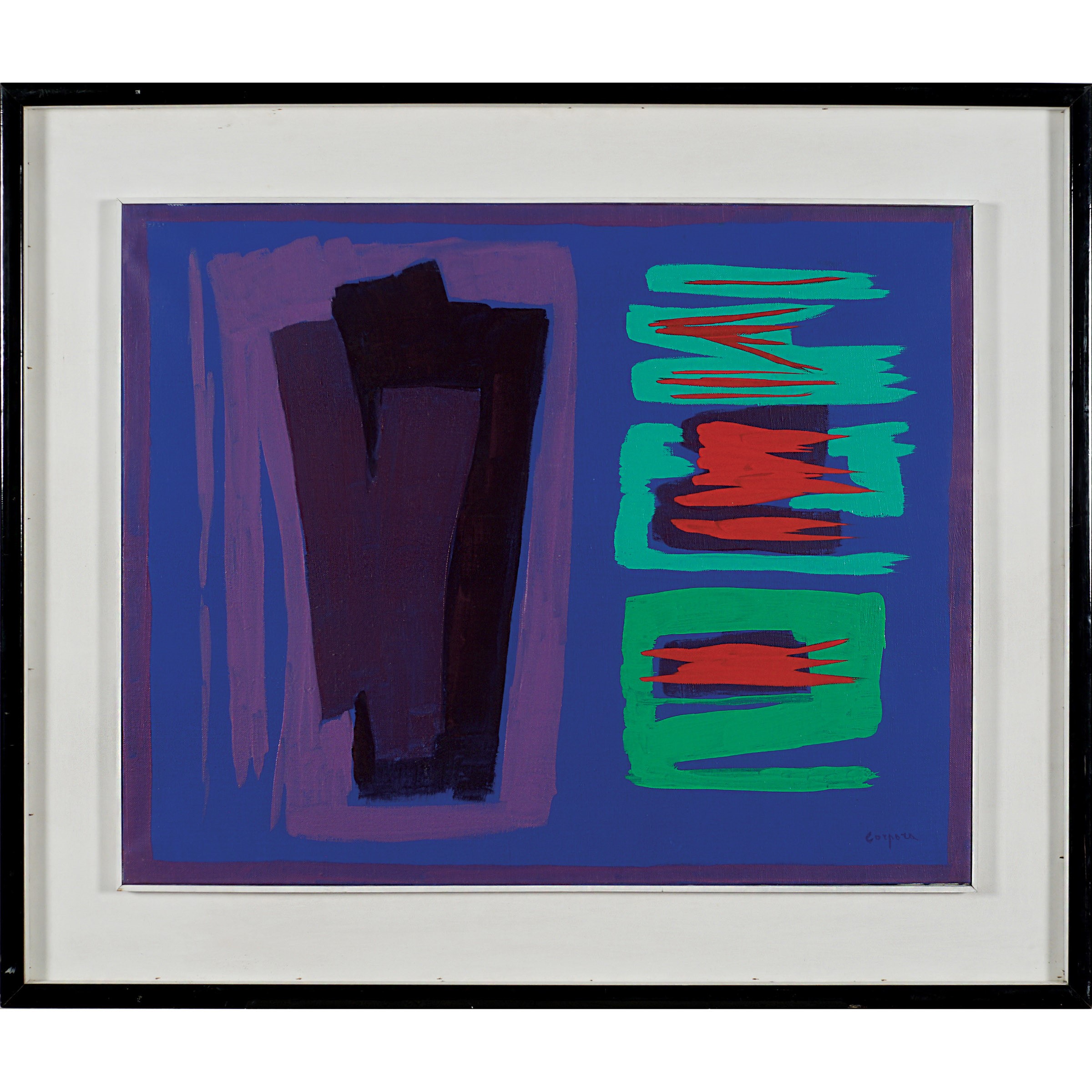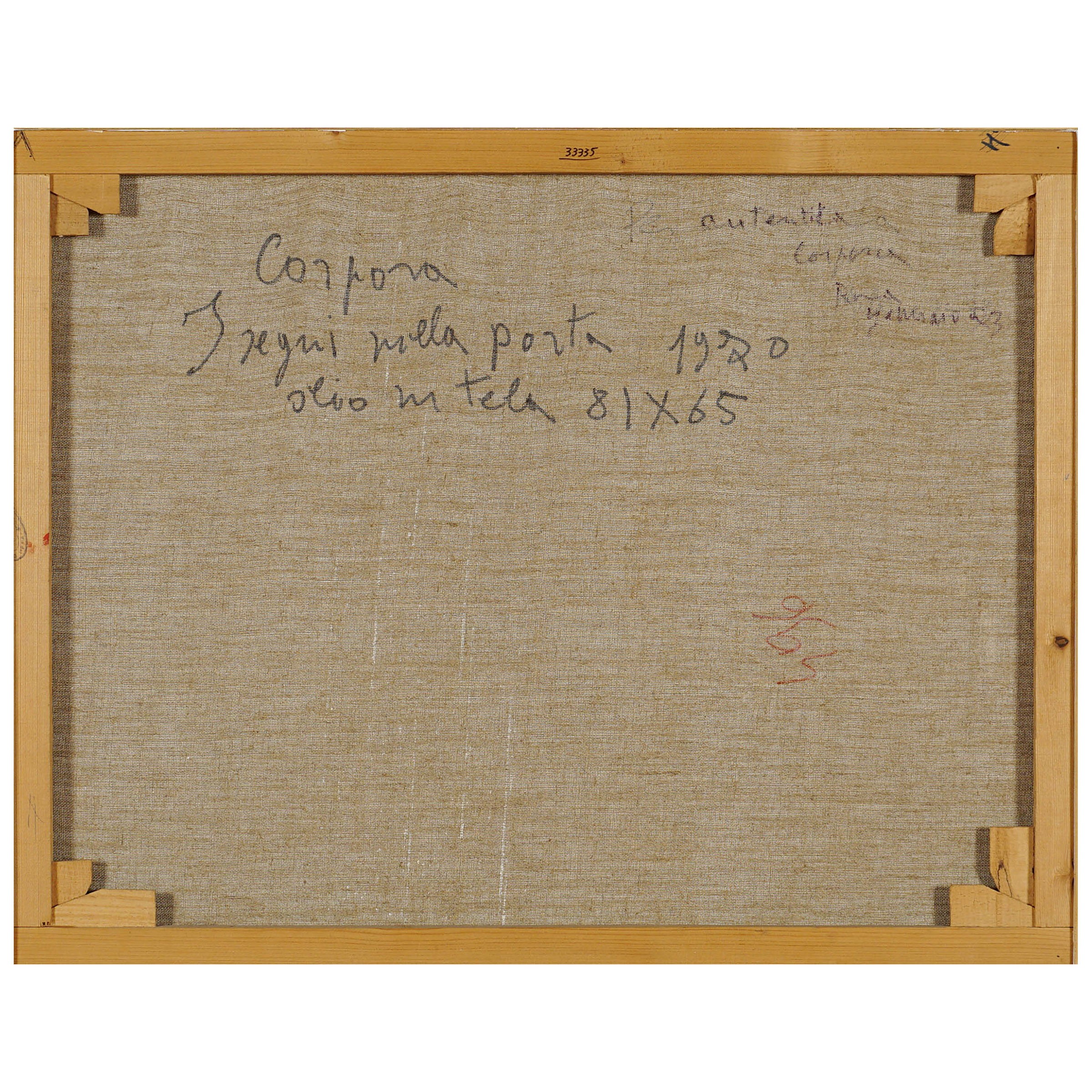 65x81 cm. Tunisi 1909- Roma 2004 I segni sulla porta, 1970, olio su tela, firmato in basso destra, firmato per autentica, datato e titolato sul retro, entro cornice. Dichiarazione d'autenticità dell'artista datata dicembre 1973 Dichiarazione d'autenticità del Prof. Giovanni Di Summa, datata maggio 2005