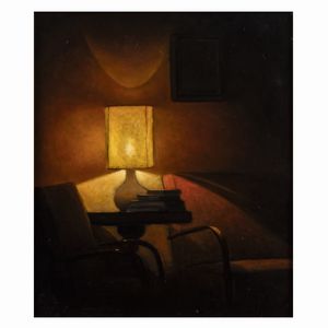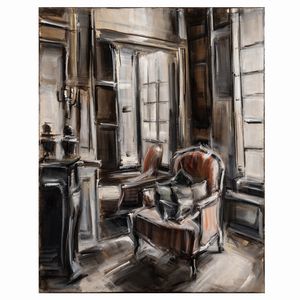 50x40 cm. Bari 1968 Nelle stanze di Andrea, la poltrona a righe, 2012, olio su tela, firmato, datato e titolato [..]