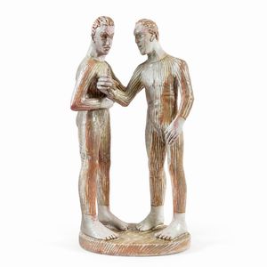 68x34x20 cm. Castelbolognese 1954 Uomini in calzamaglia, 1999, scultura in terracotta smaltata e lustro, firmata [..]