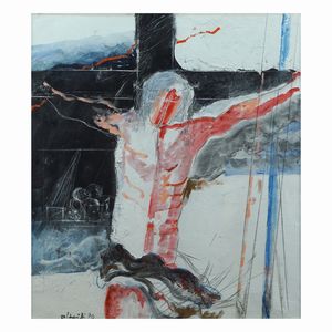 90x80 cm. Italia, XX Sec. Crocifissione, 1990, tecnica mista su tela, firmato e datato in basso a sinistra, entro [..]