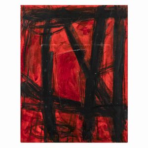 45x30 cm. Roma 1945 Senza titolo rosso, tecnica mista su tela, firmato e titolato sul retro