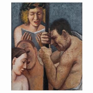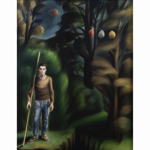 50x70 cm. Roma 1965 - 2019 L'albero sempre verde, 1991, olio su tavola, firmato, datato e titolato sul retro
