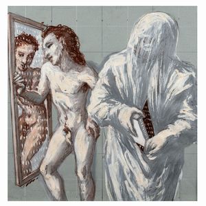 60x50 cm. Innsbruck 1947 Piccola allegoria, 2000, olio su tela di juta, siglato in basso a destra, firmato e [..]