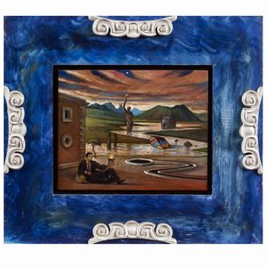20x25 cm. Zavia 1959 Paesaggio fantastico, olio su tela applicata su tavola, entro cornice