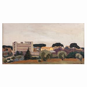 30x60 cm. Gradoli 1950 Cittŕ (verso la pineta Sacchetti), 1984, olio su tela, firmato e datato in basso a destra [..]