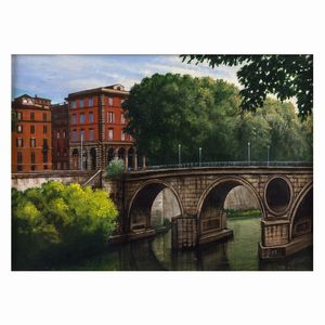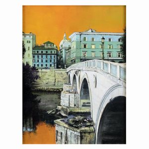 30x40 cm. Roma 1971 Ponte Sisto, 2005, olio su tela, firmato e datato al centro, entro cornice