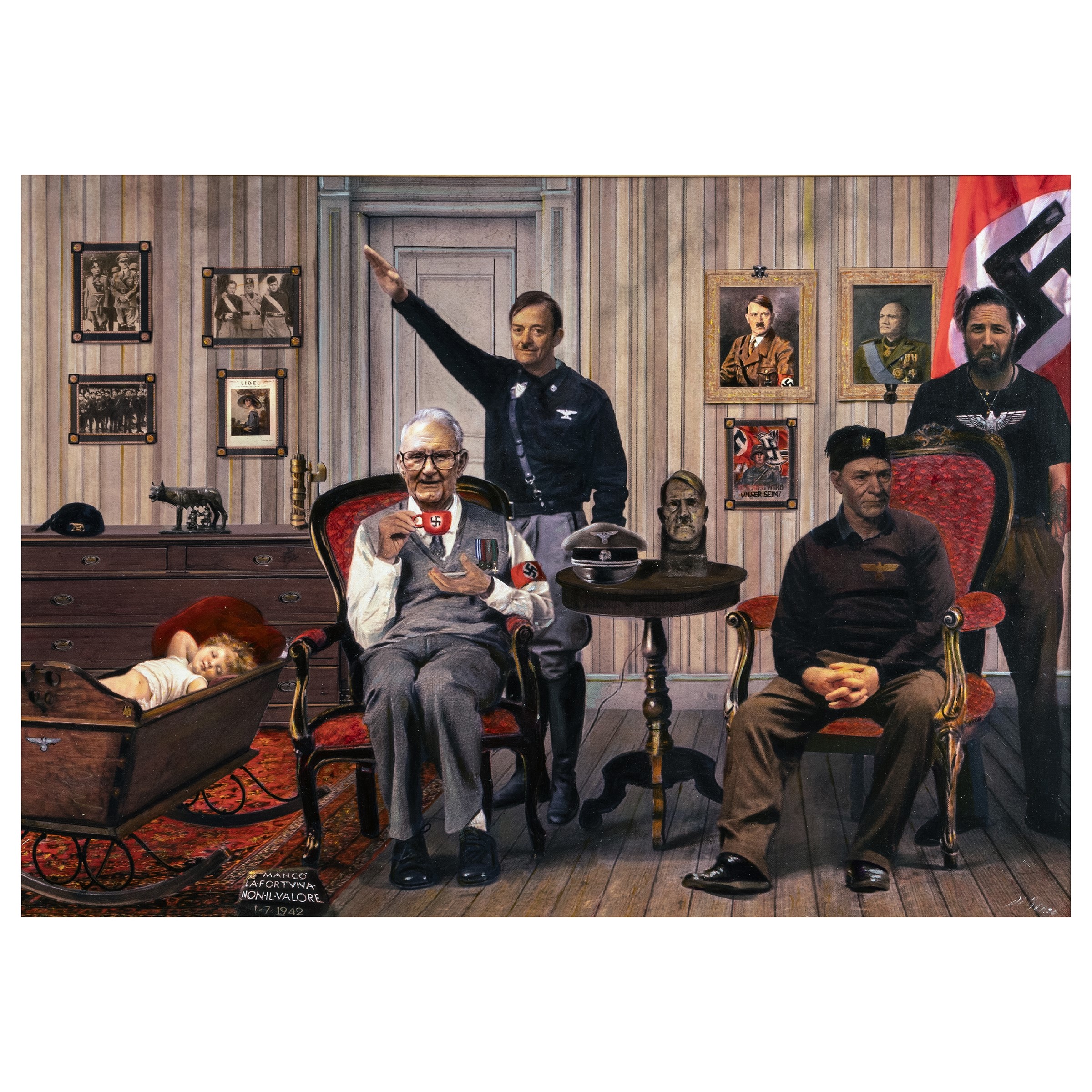 Chieti 1946 Riunione di una famiglia nostalgica, olio su tela, firmato in basso a destra, entro cornice. Autentica dell'artista su foto