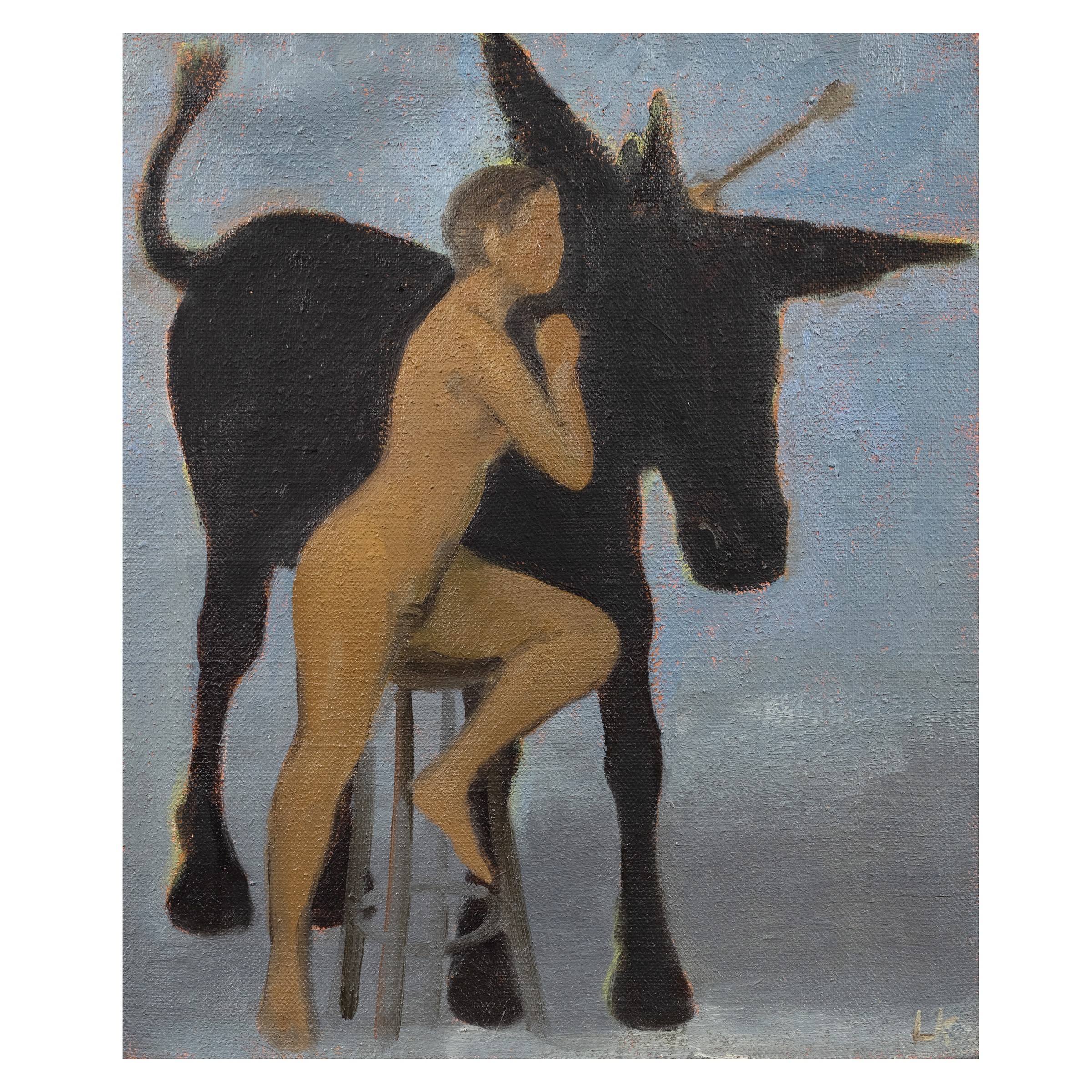 Innsbruck 1947 Piccola allegoria, 2000, olio su tela di juta, siglato in basso a destra, firmato e datato sul retro