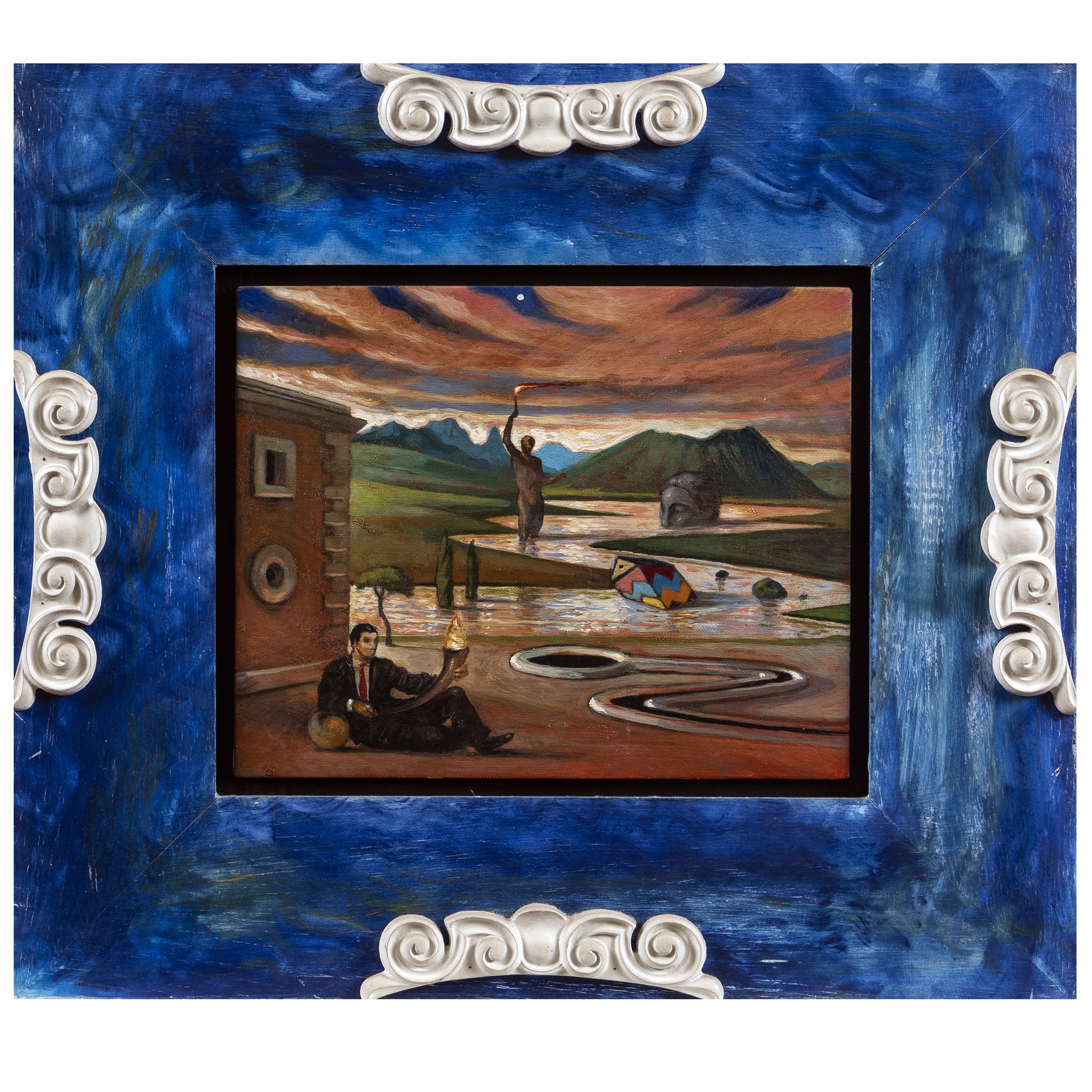 Zavia 1959 Paesaggio fantastico, olio su tela applicata su tavola, entro cornice
