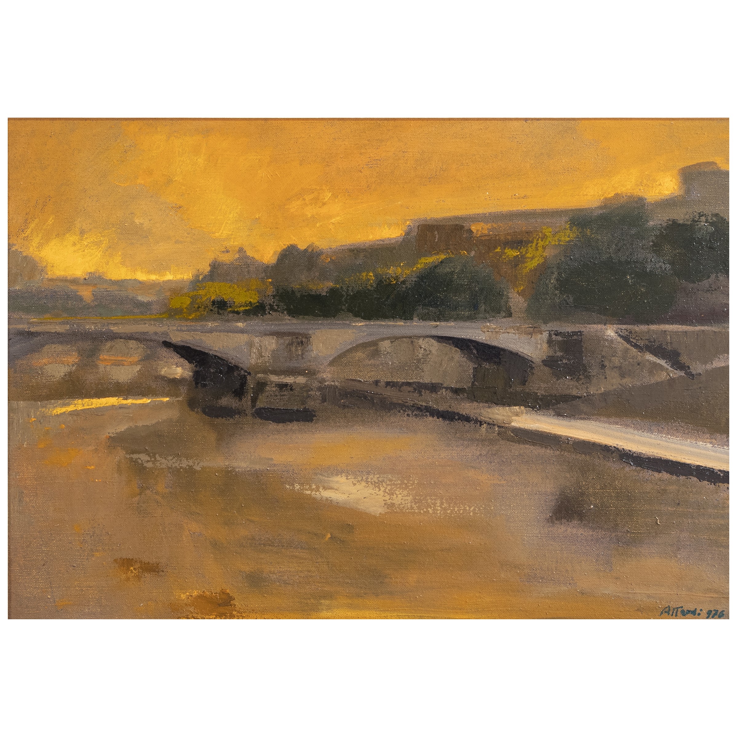 Genova 1923 - Roma 2006 Veduta del Tevere, 1976, olio su tela, firmato in basso a destra, firmato e datato sul retro, entro cornice
