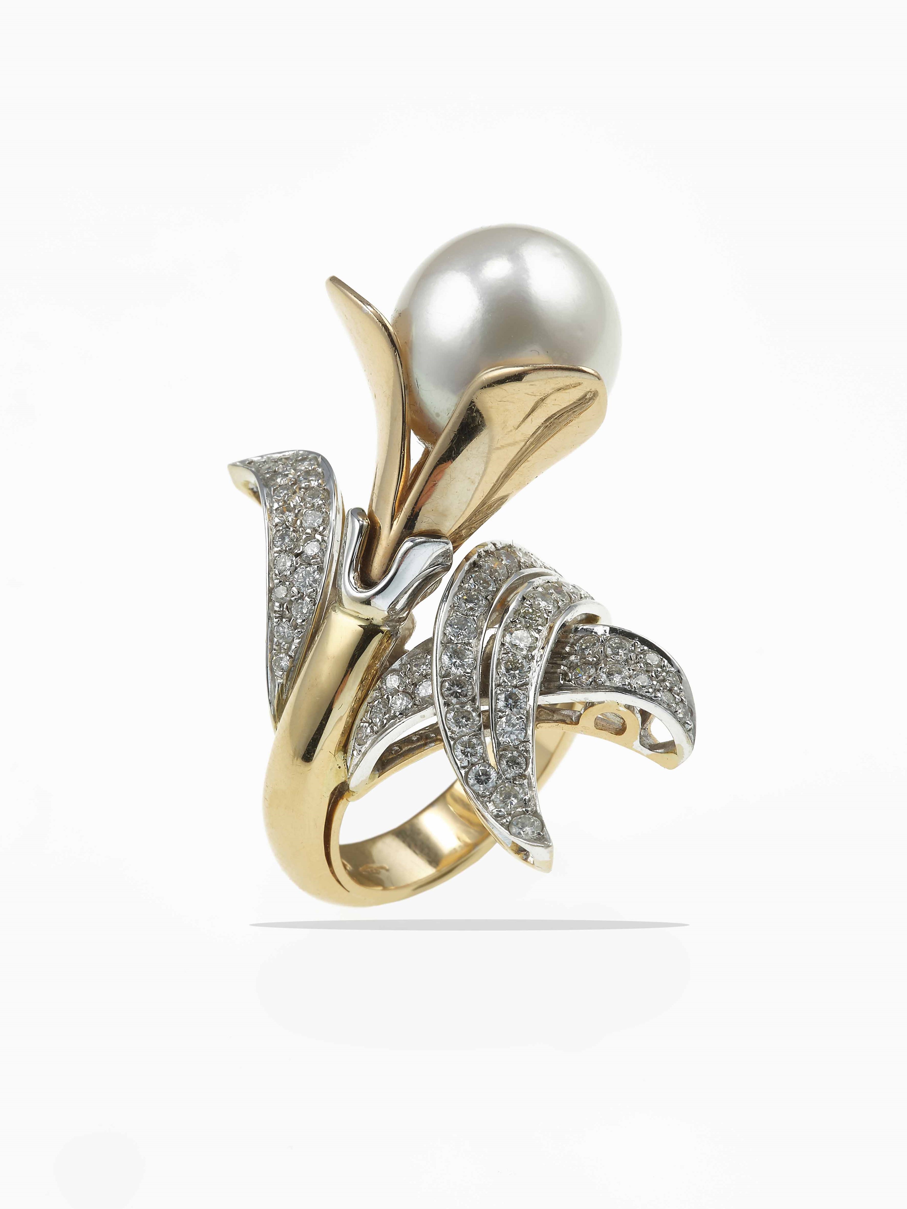 Anello con grande perla coltivata e diamanti taglio brillante