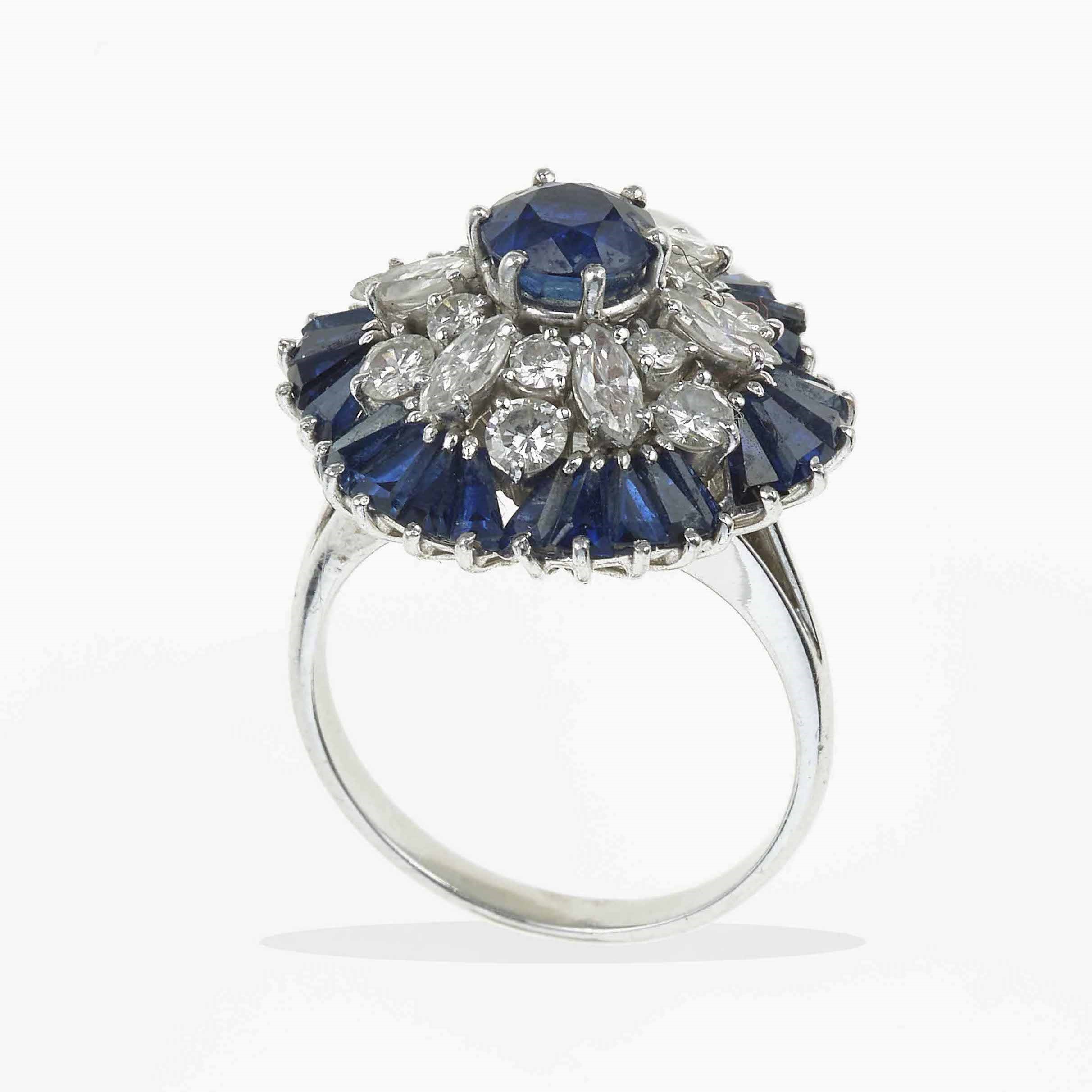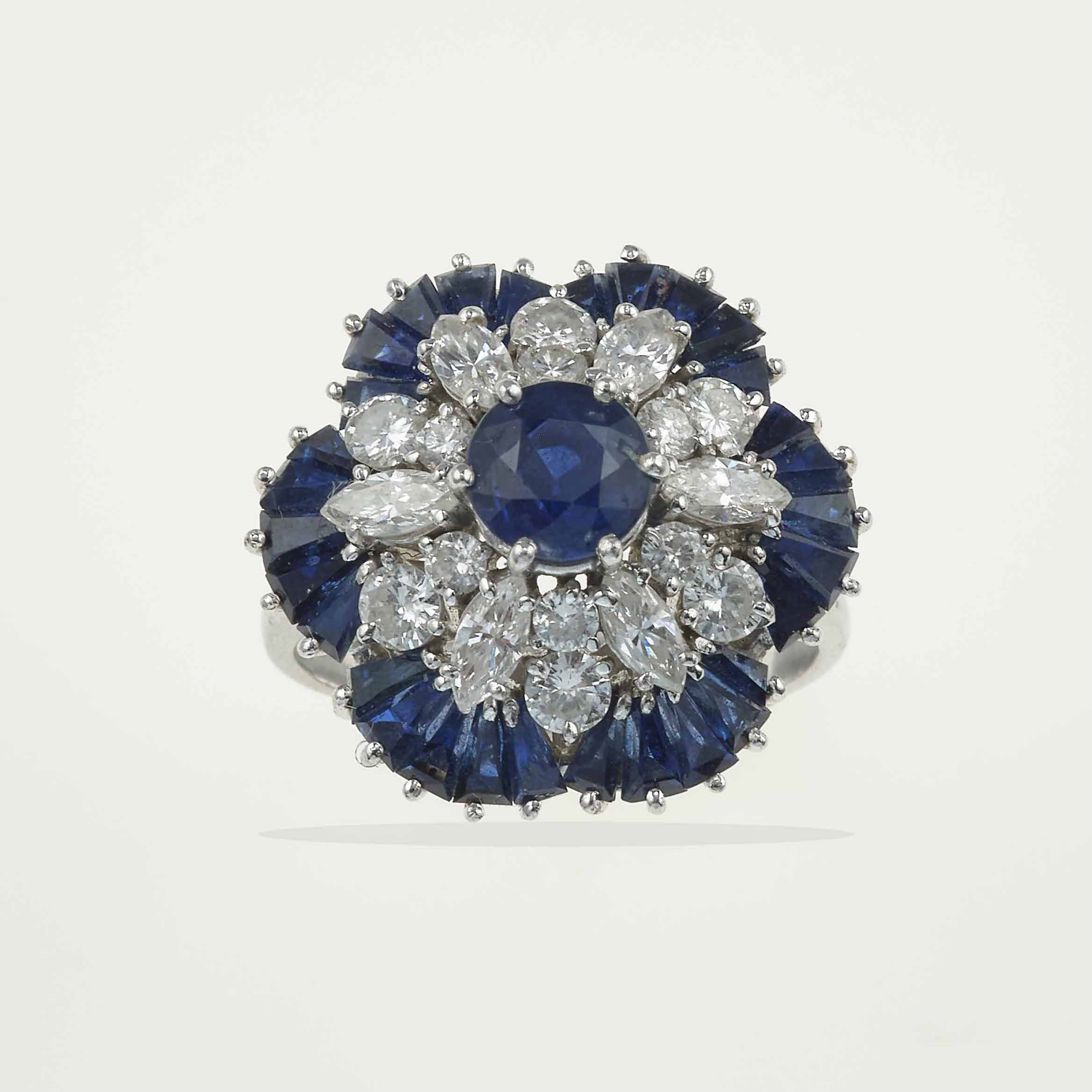 Anello con zaffiri e diamanti taglio brillante e navette
