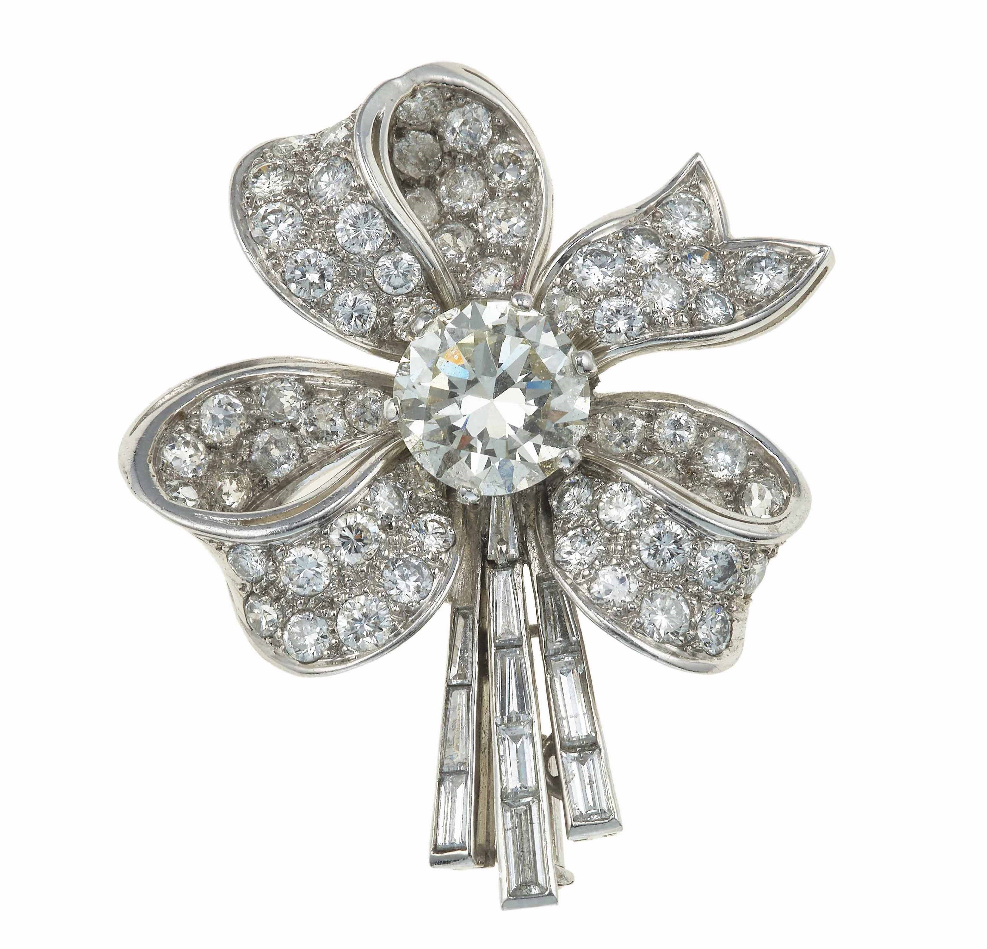 Ansuini. Spilla fiocco con diamante centrale taglio brillante di ct 3.76, colore [..]