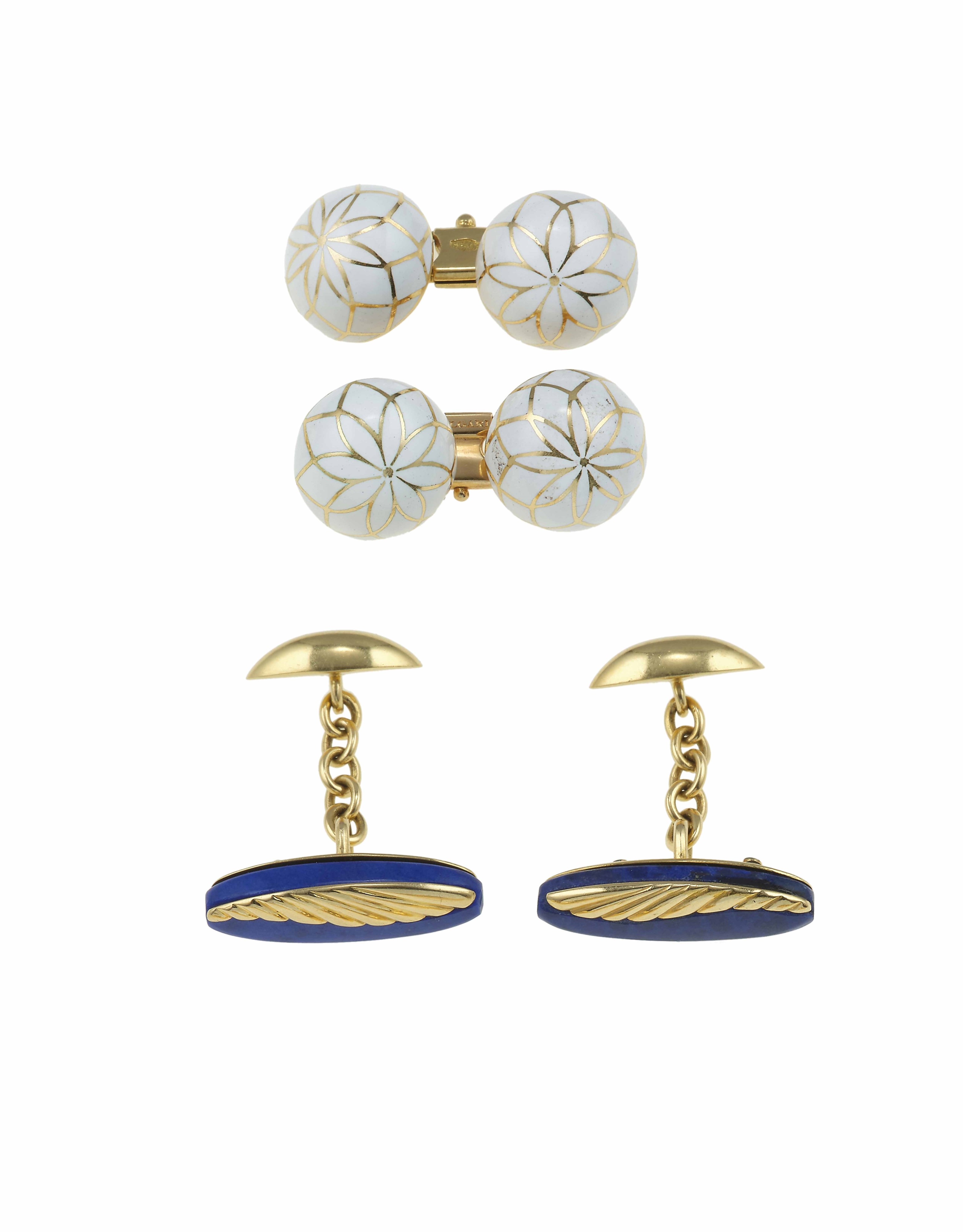 Bulgari. Due paia di bottoni da polso, smalto bianco e lapislazzulo