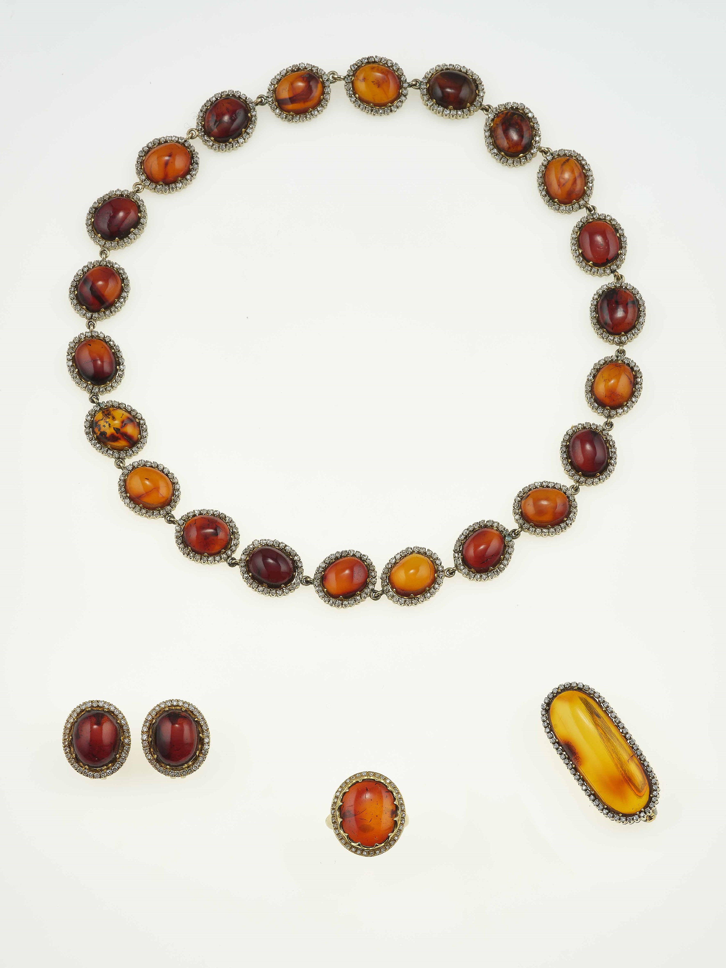 Parure composto da girocollo, orecchini, anello e spilla in ambra e diamanti taglio [..]