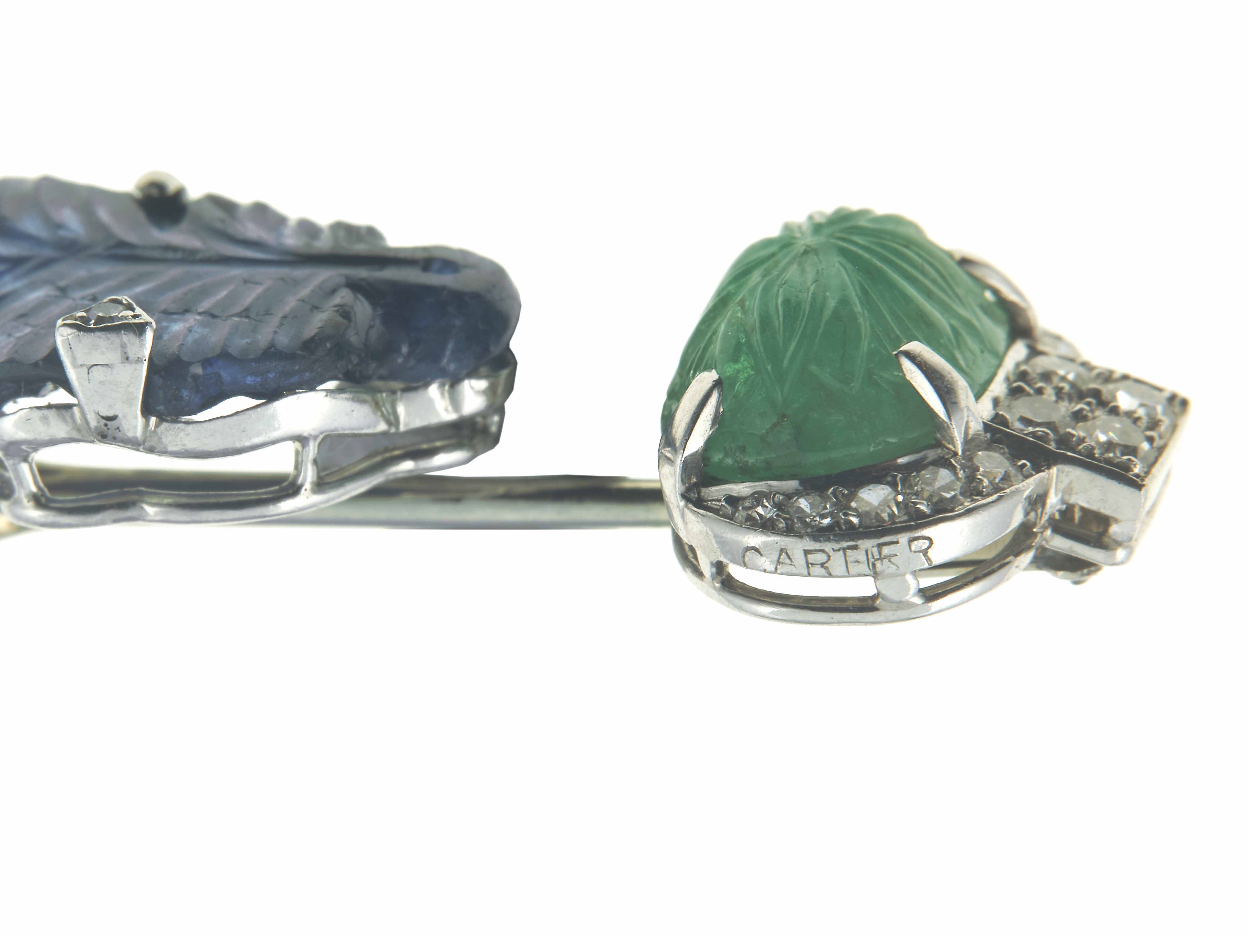 Spilla con smeraldo e zaffiro incisi e piccoli diamanti