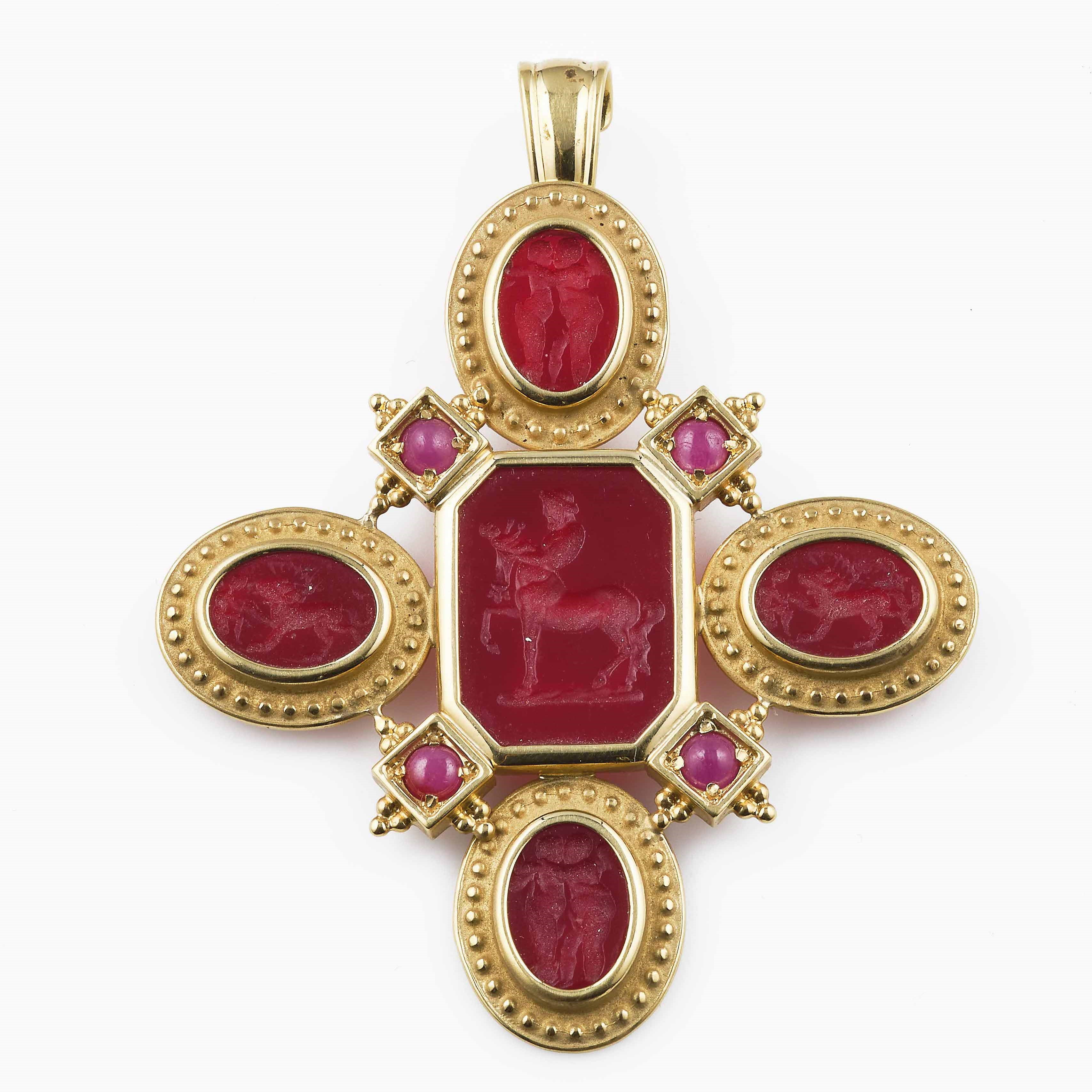 Tagliamonte. Pendente con vetri incisi e piccoli rubini
