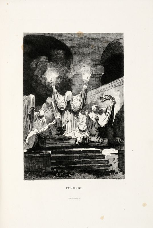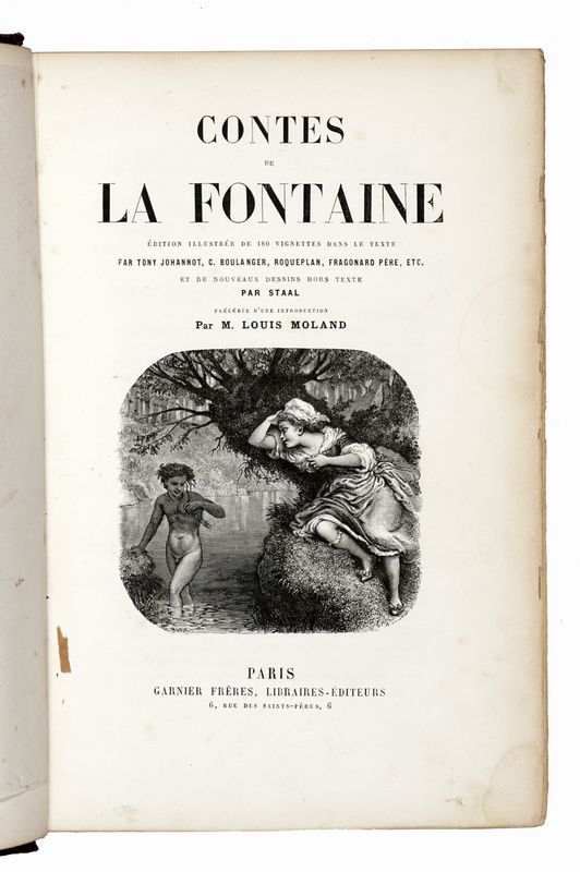 2 volumi in-folio (mm 320x240). Numerose illustrazioni impresse in nero fuori testo, ciascuna protetta da velina. Sporadiche fioriture. Legatura coeva in mezzo marocchino rosso con piatti in carta marmorizzata e titoli impressi in oro al dorso. Minime mancanze lungo cerniere e unghiature. SI AGGIUNGE: Id., Contes [...] edition illustree de 180 vignettes dans le texte [...] precedee d'une introduction par M. Louis Moland. Paris: Garnier freres, [1881]. 1 volume in-4° (mm 264x180).