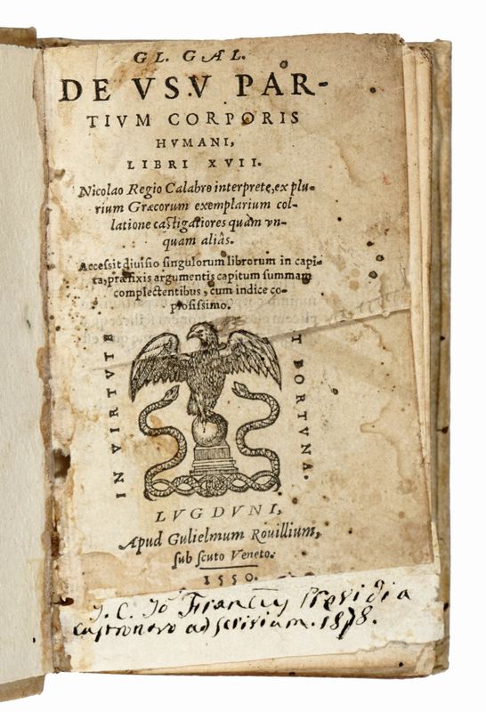 In-16° (mm 120x70). Marca tipografica al frontespizio. Un'integrazione di carta con nota di possesso manoscritta, datata 1878, al margine inferiore del frontespizio, parzialmente staccato. Copia rifilata, con gore marginali, macchie e fioriture sparse. Legatura in piena pergamena rigida con titoli manoscritti al dorso. Sguardie rinnovate e tagli in oro. Esemplare da studio.