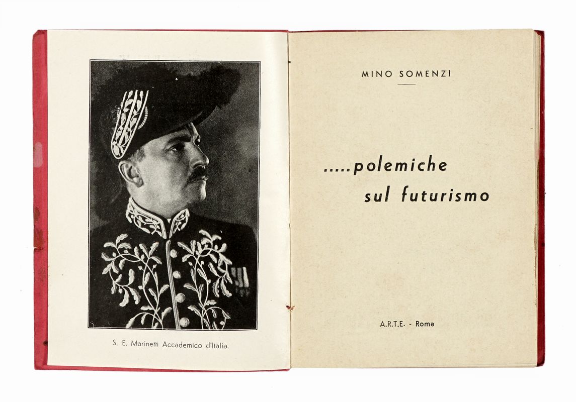 In-16° (mm 165x120). Con numerose tavole in bianco e nero, a piena pagina, nel testo di opere di artisti futuristi. Usuali bruniture della carta. Brossura originale rossa illustrata con grafica parolibera da Tullio D'Albisola. Macchie a piatto anteriore e altre minime mende. SI AGGIUNGE: Settimelli Emilio, Marinetti. L'uomo e l'artista. Milano: edizioni Futuriste di Poesia, 1921. In-8° (mm 190x125). Brossura editoriale con titoli in rosso e nero al piatto; mancanze al dorso, macchioline e strappetti ai piatti.