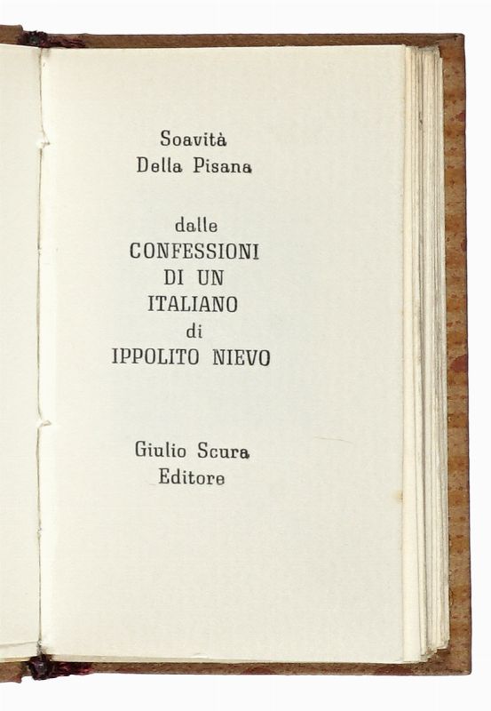 2 collane da 3 volumetti ciascuna in-128° (mm 63x35). Ognuna contiene: Manzoni Alessandro, Sulla modestia e sull'umiltà. (1964); Mazzini Giuseppe, Doveri verso l'umanità. (1965); Nievo Ippolito, Soavità della Pisana dalle confessioni di un italiano. (1966). Entrambe in legatura in carta decorata con titoli su tassello al dorso; entro cofanetto in carta decorata.