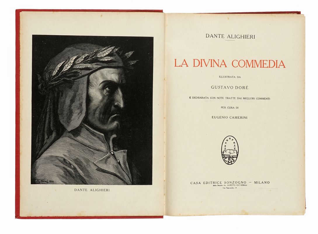 In-4° (mm 335x237). Ottimo esemplare riccamente illustrato, con numerose tavole in bianco e nero a piena pagina nel testo. Rare macchie marginali. Legatura in piena tela editoriale con titoli e profilo di Dante impressi in oro e a secco, entro duplice cornice di filetti al piatto anteriore e al dorso. SI AGGIUNGE: Ariosto Lodovico, Orlando Furioso [...] illustrato da 517 disegni di Gustavo Doré. Milano: Fratell Treves, 1894. In-8° (mm 265x180).