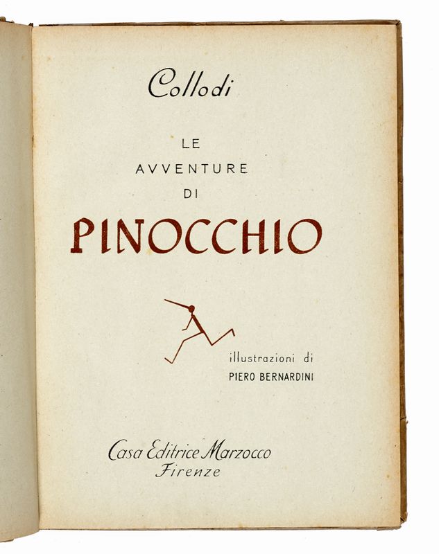 In-8° (mm 233x169). Con numerose illustrazioni a colori, anche a piena pagina, nel testo. Legatura originale in pieno cartonato, con titoli e la sagoma di Pinocchio in legno al piatto anteriore; sguardie decorate. Internamente allentato il piatto anteriore.