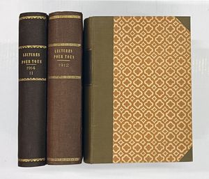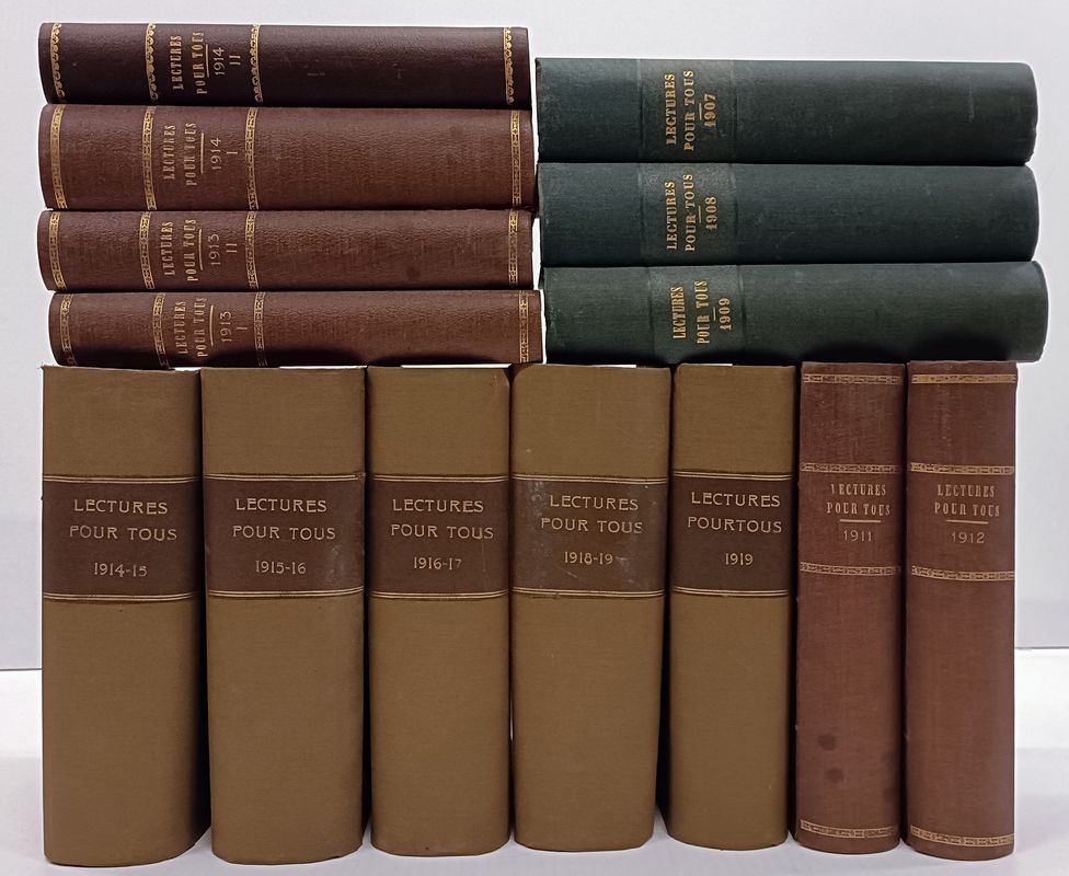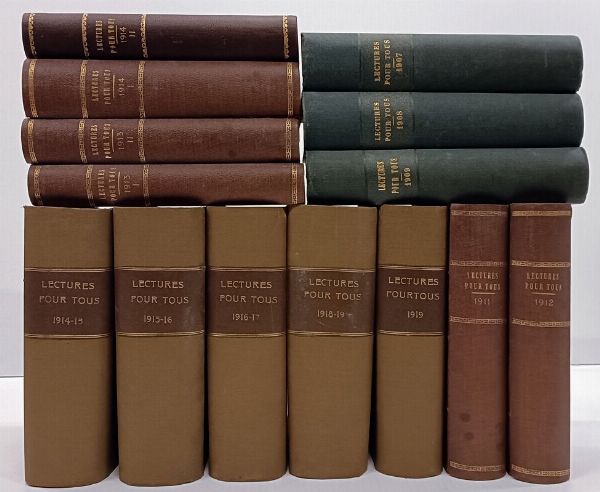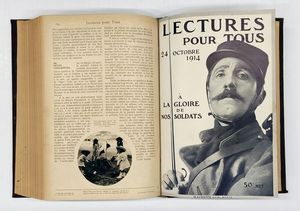 14 volumi in-8° (mm 238x160). 12 annate complete: dall'anno X (1907) all'anno XXI (1919). Riccamente illustrato. Alcune carte brunite. Legatura in piena e mezza tela con titoli in oro impressi al dorso; brossure originali, molte delle quali a colori, conservate all'interno. Macchie e muffe ai piatti anteriori delle annate 1907-1909.