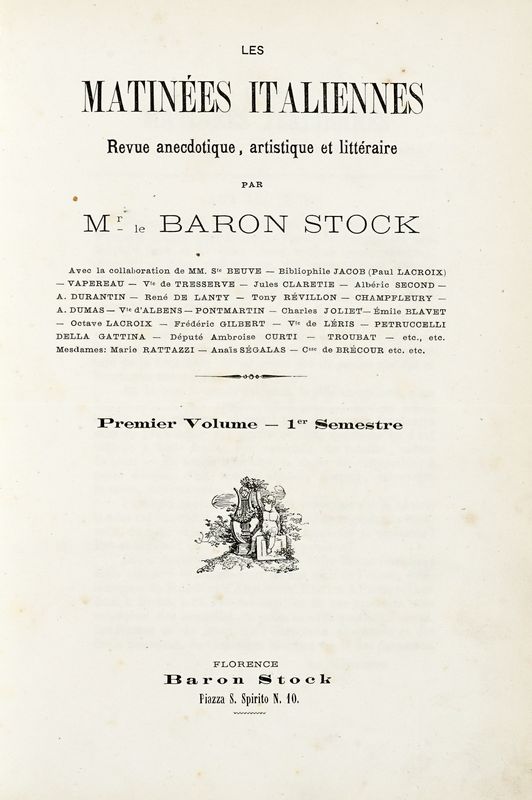 4 volumi in-4° (mm 270x194). Con illustrazioni a piena pagina fuori testo. Sporadiche fioriture, alcuni fascicoli bruniti. Legatura coeva in mezzo marocchino viola con piatti in percallina e titoli e decorazioni impressi in oro ai piatti. Sguardie in carta marmorizzata. Ex-libris applicato in principio di ciascun volume, piccolo timbro a inchiostro blu di precedente collezione alla prima carta di testo.