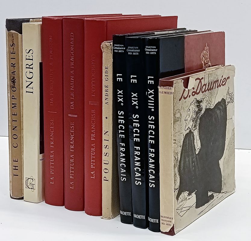 Compongono il lotto: 1) Sachs Maurice, Honoré Daumier. Avec 196 planches dont 4 en couleurs. Paris: Pierre Tisné, s.d. 2) Rosenblum Robert, Jean Auguste Dominique Ingres. Milano: Garzanti, 1973. 3) Gide André, "Les demi-dieux". Poussin. Paris: Au Divan, 1945. 4) Thuillier J., Châtelet A., La pittura francese. Da Le Nain a Fragonard. Ginevra: Skira, 1964. 5) Châtelet A., Thuillier J., La pittura francese. Da Fouquet a Poussin. Ginevra: Skira, 1963. Elenco completo disponibile su richiesta.